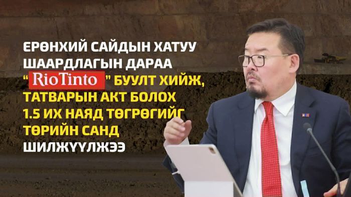 Өндөр настан Д.Балбармаа: Насаараа цай, сүүний дээжээ сүслэн өргөсөн Төрийн сүлдээ бодитоор нь харж, танилцлаа1 сар 22. 14:41 338 хүн нэг удаа хэрэглэх хэмжээний хар тамхины эргэлтийг таслан зогсоожээ1 сар 22. 14:37 Өнөөдөр цахилгаан хязгаарлаж болзошгүй байршлууд1 сар 22. 12:51 СЭРЭМЖЛҮҮЛЭГ: Тэтгэвэрт гарсан иргэдийг онилсон цахим залилангийн гэмт хэрэг бүртгэгдэж байна1 сар 22. 10:54 Ирэх хоёрдугаар сард олон жилийн дунджаас хүйтэн байна1 сар 22. 10:20 Ерөнхий сайд Г.Занданшатар Швейцарын Холбооны Улсын Ерөнхийлөгч Ги Пармелантай уулзав1 сар 22. 9:37 "Оройгүй сүм"-ийг санагдуулам "Гэгээн" бүтээлийн тухай залуус юу хэлэв1 сар 22. 9:34 Б.Чойжилсүрэнг “буцаах” цаг нь болжээ1 сар 22. 9:27 Ерөнхий сайд Г.Занданшатар Бельгийн Хаант Улсын Ерөнхий сайд Барт Де Вевертэй уулзав1 сар 22. 9:08 ТББХ намрын ээлжит чуулганы хугацаанд нийт 28 асуудлыг хэлэлцэж, 21 тогтоолыг баталжээ1 сар 22. 9:02 Цаг агаар: Улаанбаатарт өдөртөө 22 хэм хүйтэн1 сар 22. 8:55 Б.Чойжилсүрэн: Зуухны гэмтлийг шуурхай засварлаж байна, өнөөдөртөө хэвийн горимд шилжүүлнэ1 сар 21. 13:48 Монголбанк 126 ажилтнаа цомхотгожээ1 сар 21. 11:31 Битүүний өдрийг амралтын өдөрт шилжүүлэхээр шийдвэрлэжээ1 сар 21. 11:19 Түгээмэл тархацтай ашигт малтмалын тухай хуульд нэмэлт, өөрчлөлт оруулах тухай хуулийн төслийн хүрээнд холбогдох яамны мэдээллийг сонслоо1 сар 21. 11:12 П.Болдбаатар: "ТЭЦ-IV" дээр шинээр нэг зуух авах саналыг 2018 оноос тавьсан ч өнөөдрийг хүртэл шийдээгүй. Бид өндөр эрсдэлд байна1 сар 21. 10:35 Зудын эрсдэлийг хохирол багатай даван туулах зорилгоор нөхөн төлбөрийг нэг удаа урьдчилан олгож болно1 сар 21. 10:29 Г.Занданшатар: Сурагч бүрийн онцлогт нийцүүлсэн, хиймэл оюунд суурилсан "туслах багш" хөгжүүлж байна1 сар 21. 9:30 НӨАТ-ын сугалааны тохирол өнөөдөр болно1 сар 21. 9:24 Дэлхийн аялал жуулчлалын ирэх 10 жилийг тодорхойлох зорилготой хуралдаанд Ерөнхий Сайд Г.Занданшатар оролцож, үг хэлэв1 сар 21. 9:13 Цаг агаар: Улаанбаатарт өдөртөө 23 хэм хүйтэн1 сар 21. 9:04 Ерөнхий сайд Г.Занданшатар БНСУ-ын Худалдааны сайд Ё Хан Гү-тэй уулзаж, санал солилцлоо1 сар 20. 19:02 “Н.Тавинбэхийн хам хэрэгтэн Б.Насантогтохыг MCS-тэй холбох нь захиалгат улс төр” гэв1 сар 20. 17:50 Дэлхийн эдийн засгийн чуулга уулзалтад Ерөнхий сайд Г.Занданшатар тэргүүтэй төлөөлөгчид оролцож байна1 сар 20. 15:58 УИХ-ын дарга Н.Учрал “Эрдэнэнар” станцын үйл ажиллагаатай танилцлаа1 сар 20. 15:50 АИ-92 автобензиний импорт, тээвэрлэлтийн нөхцөл байдал1 сар 20. 14:17 Малайзын Засгийн газрыг хариуцлагаас чөлөөлжээ1 сар 20. 14:13 Б.Батцэцэгийг 2027 оны Ерөнхийлөгчийн сонгуульд нөөцөлж, М.Оюунчимэг, Д.Үүрийнтуяа нар СДМЭХ-ны Ерөнхийлөгчид өрсөлдөх үү1 сар 20. 14:02 Японы парламентын доод танхимыг тарааж, ээлжит бус сонгууль явуулна1 сар 20. 10:35 “Монголоос Барокко ертөнц рүү” үзэсгэлэнг Ром хотын Боргезе галерейд нээв1 сар 20. 9:58 “Цагаан алт” хөтөлбөрийн дүнд самнасан ноолуурын экспорт 330 сая ам.долларт хүрлээ1 сар 20. 9:50 Монгол Улсын баг Heyball-ын дэлхийн цомд түрүүллээ1 сар 20. 9:31 Н.Тавинбэхийг хэрэгт татсаны шалтаг нь Солонгосын төсөл, шалтгаан нь Вьетнамынх гэв үү?!1 сар 20. 9:27 Н.Энхбаяр: 126 гишүүн бүтэхгүй гэдгийг Д.Амарбаясгаланд хэлж байсан1 сар 20. 9:20 Монгол Улс хиймэл оюунд суурилсан боловсролын систем рүү шилжиж буйг сайшаав1 сар 20. 9:14 Цаг агаар: Улаанбаатарт өдөртөө 27 хэм хүйтэн1 сар 20. 9:09 "Жаргалантын гол" нэрээр албан ёсоор баталжээ1 сар 19. 16:22 Алт, мөнгөний үнэ дахин дээд үзүүлэлтэд хүрлээ1 сар 19. 16:17 Монгол Улсад хавдартай хүүхдэд 
