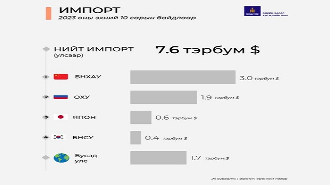 Хятад. Энэ оны эхний 10 сард импорт 7.6 тэрбум долларт хүрсний 40% буюу 3.0 тэрбум долларын бүтээгдэхүүнийг БНХАУ аас импортолжээ. Хүнд даацын машин, тоног төхөөрөмж, ахуйн болон хүнсний бараа голчлон импортолжээ.