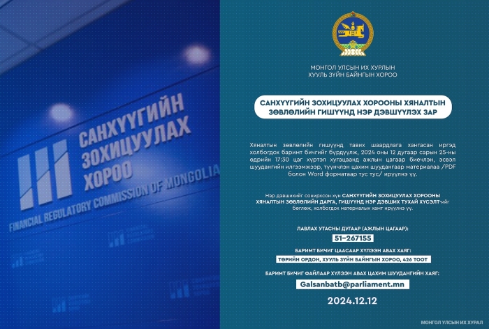 Нэр дэвшихийг сонирхсон хүн САНХҮҮГИЙН ЗОХИЦУУЛАХ ХОРООНЫ ХЯНАЛТЫН ЗӨВЛӨЛИЙН ДАРГА, ГИШҮҮНД НЭР ДЭВШИХ ТУХАЙ ХҮСЭЛТ-ийг бөглөж, холбогдох материалын хамт ирүүлнэ үү.