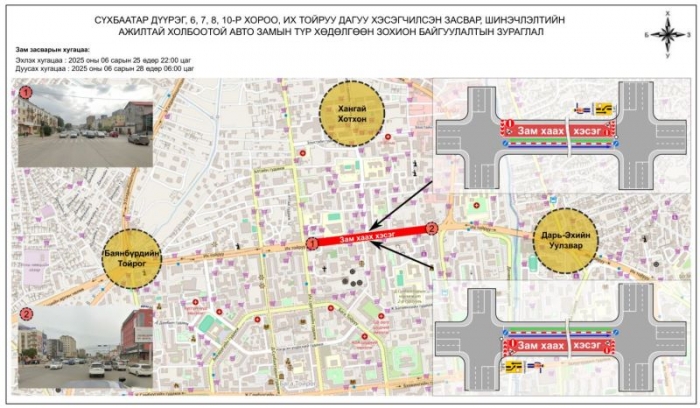 Сүхбаатар дүүрэг 6, 7, 8, 10-р хороо, Их тойруугийн авто замын хэсэгчилсэн засвар шинэчлэлтийн ажлын хүрээнд Өлзий төвөөс 100 айлын уулзвар хүртэлх авто замыг хааж шинэчилнэ.