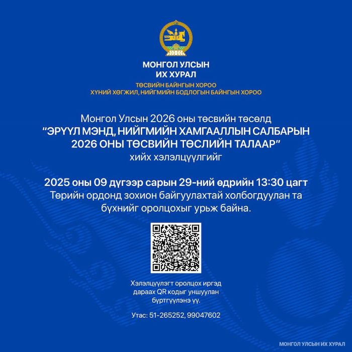 Монгол Улсын Их Хурлаар Монгол Улсын 2026 оны төсвийн төслийг хэлэлцэж байгаатай холбогдуулан Төсвийн байнгын хорооноос “Эрүүл мэнд, нийгмийн хамгааллын салбарын 2026 оны төсөв” сэдэвт хэлэлцүүлгийг 2025 оны 09 дүгээр сарын 29-ний өдөр 13:30 цагт “Төрийн ордон”, “Жанжин Д.Сүхбаатар” танхимд зохион байгуулах тул иргэн, хуулийн этгээд, хэвлэл мэдээллийн байгууллагуудын төлөөлөл Та бүхнийг оролцохыг урьж байна.