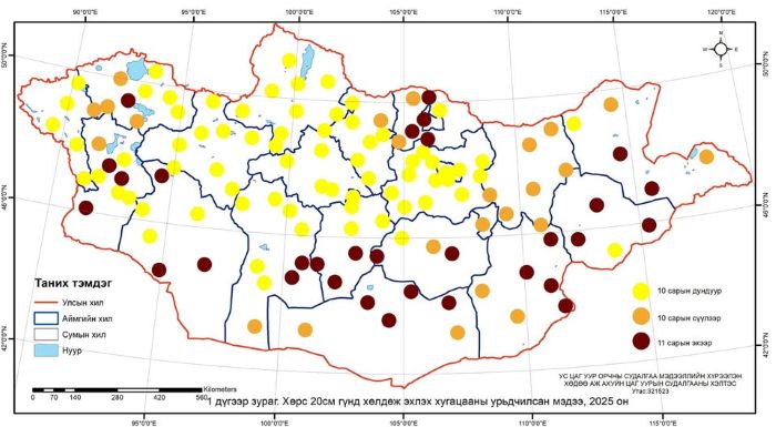 Ус цаг уур, орчны судалгаа мэдээллийн хүрээлэнгээс гаргасан тооцооллоор хөрс 20 см гүнд хөлдөж эхлэх хугацаа Өмнөговь, Дорноговь, Дорнод, Сүхбаатарын ихэнх, Говь-Алтай, Баянхонгор, Өвөрхангай, Дархан, Сэлэнгэ, Дундговийн зарим нутгаар 11 дүгээр сарын эхээр, Увс, Говьсүмбэр, Хэнтийн ихэнх нутгаар 10 дугаар сарын cүүлээр, Баян-Өлгий, Ховд, Завхан, Хөвсгөл, Архангай, Орхон, Булган, Улаанбаатар, Төвийн ихэнх нутгаар 10 дугаар сарын дунд арав хоногт байх төлөвтэй байна.