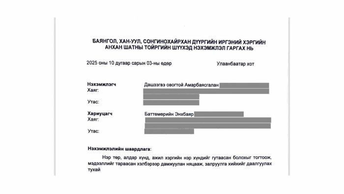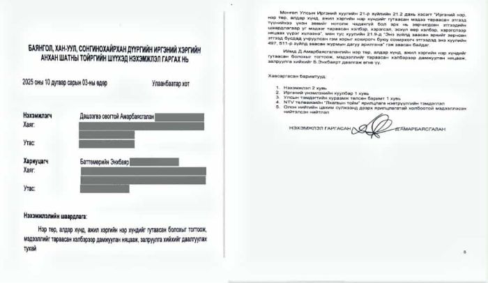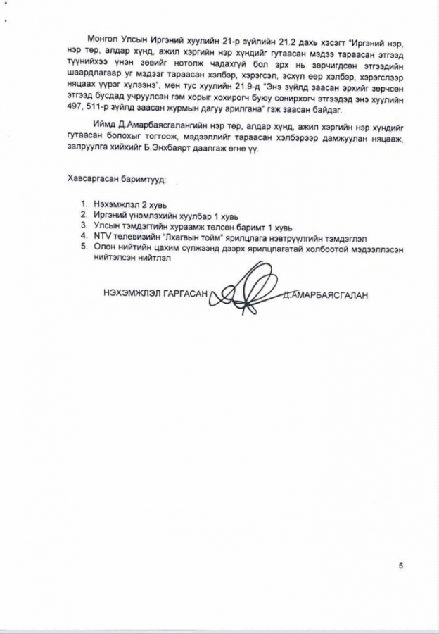 УИХ-ын дарга Д.Амарбаясгалангийн өмгөөлөгч фэйсбүүкт Buya Zorigtbaatar хаягаас "Миний бие Улсын Их Хурлын дарга Дашзэгвийн Амарбаясгалангийн өмгөөлөгчөөр ажиллаж байна. Миний үйлчлүүлэгч Д.Амарбаясгалан нь өөрийн нэр төр, алдар хүнд, ажил хэргийн нэр хүндийг гутаасан асуудлаар Улсын Их Хурлын гишүүн Б. Энхбаярыг шүүхэд өгч, Баянгол, Хан-Уул, Сонгинохайрхан дүүргийн Иргэний хэргийн анхан шатны шүүхэд нэхэмжлэл гаргасан болно. УИХ-ын дарга Д.Амарбаясгалан нь “Админерал” гэх компанитай ямар нэгэн холбоо хамааралгүй болно. Сүүлийн гурван жилийн хугацаанд түүнийг “орд эзэмшиж, нүүрс хулгайлсан” гэх ташаа мэдээлэл удаа дараа түгээж байсан бол сүүлийн үед бүр хүн амины хэрэгт холбогдуулан гүтгэх хэмжээнд хүрээд байна. Гэвч дээрх асуудлуудаар Монгол Улсын аль ч хууль хяналтын байгууллага Д.Амарбаясгаланг шалгасан, мэдүүлэг авсан тохиолдол огт байхгүйг болно. Иймд миний үйлчлүүлэгч Д.Амарбаясгалан нь өөрийн нэр төр, алдар хүнд, ажил хэргийн нэр хүндээ сэргээлгэхийн тулд шүүхэд нэхэмжлэл гарган хандсаныг албан ёсоор мэдэгдэж байна" гэв.