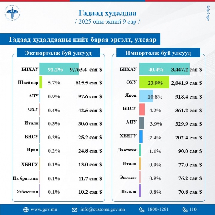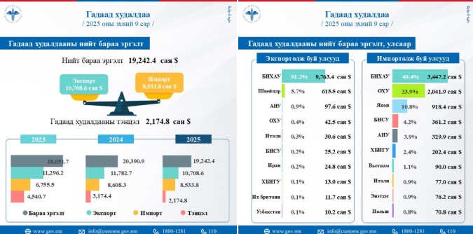 2025 оны эхний 9 сарын дүнгээр гадаад худалдааны нийт бараа эргэлт 19242.4 сая ам.доллар болж 2024 оны мөн үеэс 1148.5 сая ам.доллар буюу 5.6 хувиар буурчээ. Экспортын дүн импортын дүнгээс 2174.8 сая ам.доллараар давж, гадаад худалдааны баланс эерэг гарлаа.