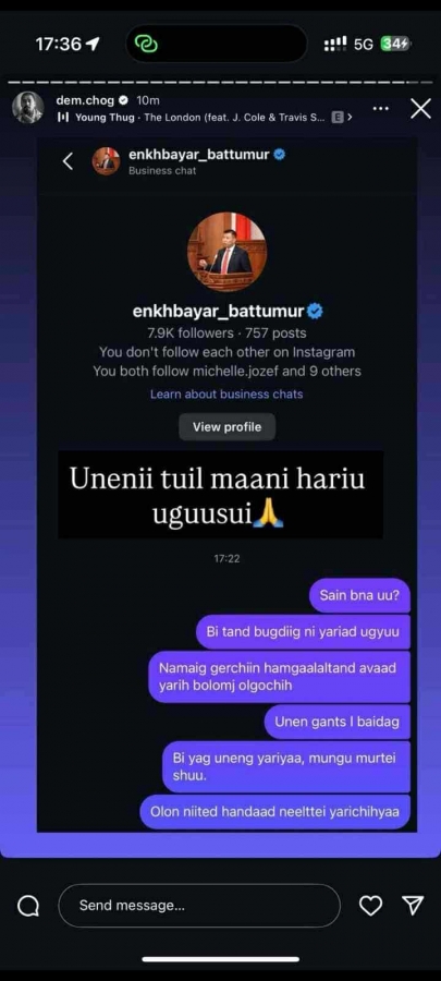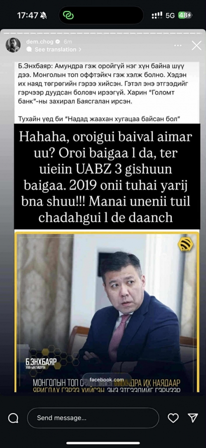 Г.Занданшатарын тэргүүлж буй Засгийн газар өчигдөр (2025.10.08) хуралдаж, нүүрсний оффтэйк гэрээнүүдийг төрийн нууцаас гаргах чиглэл өгсөн. Төрийн нууцаас гаргасан 36 оффтэйк гэрээний 31 нь “Бодь” групп буюу Д.Баясгалантай холбогдож байна. Харин УИХ-ын гишүүн Б.Энхбаяр өнөөдөр сэтгүүлчдэд мэдээлэл өгөхдөө “Монголын топ оффтэйкчин бол А.Амундра” гэж онцолсон. Тухайн үед “Бодь интернэшнл” ХХК-ийн гүйцэтгэх захирал асан А.Амундра энэхүү мэдээллийн дараа цахим хуудастаа Б.Энхбаяр гишүүн рүү илгээсэн чатаа дэлгэж “Үнэний туйл маань хариу өгөөсэй” хэмээн бичжээ. Тэрбээр УИХ-ын гишүүн Б.Энхбаярт хандаж “Би танд бүгдийг нь яриад өгье. Намайг гэрчийн хамгаалалтад аваад ярих боломж олгочих. Үнэн ганц л байдаг. Би яг үнэнийг ярья. Мөнгө мөртэй шүү. Олон нийтэд хандаад нээлттэй ярьчихъя” гэсэн байна. “Бодь интернэшнл” ХХК-ийн гүйцэтгэх захирал асан А.Амундра Б.Энхбаяр өөрийг нь “А.Амундра гэж оройгүй нэг хүн байна шүү дээ. Монголын топ оффтэйкчин гэж болно. Хэдэн их наяд төгрөгийн гэрээ хийсэн. Гэтэл энэ этгээдийг гэрчээр дуудсан ч ирээгүй” гэсэнд “Оройгүй байвал аймаар уу. Орой байгаа л даа. Тэр үеийн ҮАБЗ-ийн гурван гишүүн байгаа. 2019 оны тухай ярьж байна шүү. Манай үнэний туйл чадахгүй л дээ, даанч” гэжээ. А.Амундрагийн бичсэнчлэн 2019 оны үеийн ҮАБЗ-ийн гурав нь Х.Баттулга, У.Хүрэлсүх, Г.Занданшатар нар юм. Х.Баттулга тэр үед ҮАБЗ-ийн тэргүүн байсан бол У.Хүрэлсүх, Г.Занданшатар хоёр гишүүн нь байв.