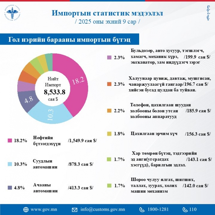 Монгол улс импортоор 2025 оны эхний 9 сарын байдлаар нийт 8.53 тэрбум ам.долларын бараа, түүхий эд импортолсон нь 2024 оны мөн үеэс 74.4 сая ам.доллароор буюу 0.9 хувиар буурсан байна.