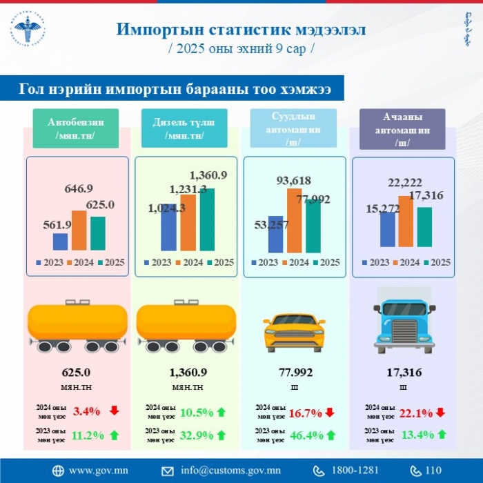 2025 оны эхний 9 сарын байдлаар суудлын болон ачааны автомашины импорт буурчээ. Тухайлбал, өмнөх оны мөн үетэй харьцуулахад 77992 ш суудлын автомашин импортолсон нь өнгөрсөн оны мөн үеэс 15626 ширхгээр буюу 16.7 хувь, 17316 ширхэг ачааны автомашин импортолсон нь өнгөрсөн оны мөн үеэс 4906 ширхгээр буюу 22.1 хувиар тус бус буурсан үзүүлэлттэй байна.