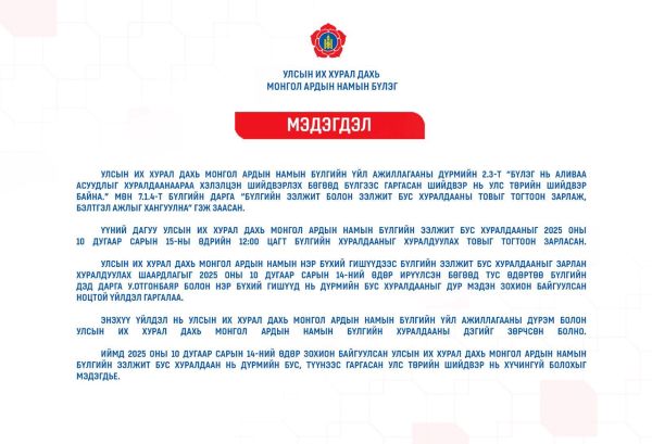 Тэтгэврийн асуудлаар хамтран ажиллах тухай хэлэлцээрийг соёрхон батлах тухай хуулийн төслийг хэлэлцэн дэмжив33 минут 46 секундын өмнөАвто замын сүлжээний ашиглалт, замын хөдөлгөөний аюулгүй байдал, өвөлжилтийн бэлтгэл хангахыг даалгав37 минут 45 секундын өмнөЕрөнхийлөгч У.Хүрэлсүхэд БНЭУ-ын дэд Ерөнхийлөгч бөгөөд Парламентын дээд танхимын дарга бараалхав45 минут 1 секундын өмнөД.Уужимсанааг “Админерал” ХХК-тай холбоотой асуудлаар АТГ саатуулсан уу50 минут 21 секундын өмнөЕрөнхий боловсролын цахим сургууль байгууллаа1 цаг 18 минутын өмнөБ.Энхбаяр ирэх баасан гарагт ХЗДХ-ийн сайдын ажилдаа орно1 цаг 20 минутын өмнөЗГ: “Монгол Улсыг 2026-2030 онд хөгжүүлэх таван жилийн үндсэн чиглэл батлах тухай” тогтоолын төслийг УИХ-д өргөн мэдүүлнэ1 цаг 33 минутын өмнөМонгол Улсын Ерөнхийлөгч У.Хүрэлсүх Махатма Ганди-гийн дурсгалын цогцолборт цэцэг өргөлөө1 цаг 38 минутын өмнөМонгол Улсын Ерөнхийлөгч У.Хүрэлсүх Бүгд Найрамдах Энэтхэг Улсын Ерөнхийлөгч Дроупади Мурму-тай уулзлаа2 цаг 6 минутын өмнөБ.Жавхлан: Төсвийн зардлыг 10 хувиар бууруулж, цалин, тэтгэвэр нэмэх санхүүжилтийг шийднэ2 цаг 26 минутын өмнөДэлхийн эдийн засгийн өсөлтийн төсөөллийг ахиулжээ3 цаг 18 минутын өмнөУлсын Их Хурал дахь Монгол Ардын намын бүлэг мэдэгдэл гаргалаа3 цаг 22 минутын өмнөХурандаа Р.Энхболд: Цэргийн дэглэлт, оны ялгааг арилгахын тулд жилд нэг удаа цэрэг татдаг болсон4 цаг 39 минутын өмнөЕрөнхийлөгч У.Хүрэлсүх, Ерөнхий сайд Н.Моди нар ”Стратегийн түншлэл”-ийг бэхжүүлэх тухай Хамтарсан мэдэгдэл гаргалаа4 цаг 47 минутын өмнөБагш эмч нар болон ахмадын тэтгэврийг нэмэх асуудлыг хэлэлцэнэ5 цаг 2 минутын өмнөЭнэтхэгт үйлдвэрлэсэн сироп эрүүл мэндэд эрсдэлтэйг анхааруулав5 цаг 6 минутын өмнөТБХ: Монгол Улсын 2026 оны төсвийн тухай хуулийн төсөлтэй хамт өргөн мэдүүлсэн хууль, тогтоолын төслүүдийг хэлэлцэх нь зүйтэй гэж үзлээ6 цаг 4 минутын өмнөЦаг агаар: Улаанбаатарт өдөртөө 0 хэм орчим6 цаг 16 минутын өмнөМонгол Улс, Энэтхэг Улсын харилцаа, хамтын ажиллагааг өргөжүүлэн хөгжүүлэх баримт бичигт гарын үсэг зурав10 сар 14. 21:14Монгол Улсын Ерөнхийлөгч У.Хүрэлсүх, Бүгд Найрамдах Энэтхэг Улсын Ерөнхий Сайд Нарендра Моди нар албан ёсны хэлэлцээ хийлээ10 сар 14. 21:03Г.Занданшатар: Багш нарын цалинг 15-20 хувь, эмч нарынхыг 10-15 хувь, ахмадуудын тэтгэврийг 8 хувиар нэмэхээр шийдвэрлэлээ10 сар 14. 19:26Монгол Улсын Ерөнхийлөгч У.Хүрэлсүхийг БНЭУ-ын Ерөнхий сайд Нарендра Моди угтлаа10 сар 14. 17:12Ц.Сандаг-Очир гишүүн төрийн эрхэнд хууль бусаар халдаж байна уу10 сар 14. 15:49Эрүүгийн 934 хэрэгт мөрдөн байцаалтын ажиллагаа явуулав10 сар 14. 14:40НӨАТ-ын урамшууллын сугалааны тохирол лхагва гарагт болно10 сар 14. 13:59Оюу толгойн зээлийн хүүг бууруулахаар хөрөнгө оруулагч талд хэлэлцэх санал хүргүүллээ10 сар 14. 12:01Өвлийн дугуй нь халтиргаатай замд автомашины зогсох чадварыг 30-40 хувиар нэмэгдүүлдэг10 сар 14. 11:31М.Бадамсүрэн: Төрийн үйл ажиллагаа тасралтгүй явах ёстой гэсэн зарчмыг үнэндээ хөсөрдүүлж байна10 сар 14. 11:27Мадакаскарын Ерөнхийлөгч эх орноосоо явжээ10 сар 14. 11:15Багш нар ажил хаях уу: Таван өөр хариулт10 сар 14. 10:07