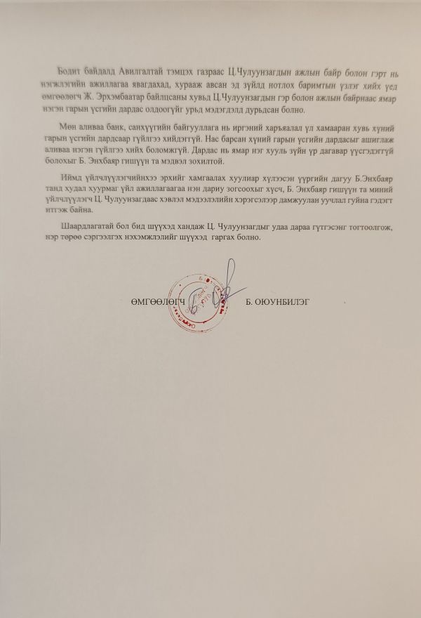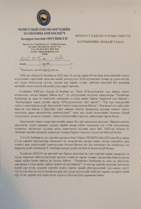 МАН-ын нарийн бичгийн дарга Ц.Чулуунзагдыг АТГ-ынхан өнгөрсөн сард саатуулсан. Түүнийг хорих хугацааг дахин 30 хоногоор сунгасан юм. УИХ-ын гишүүн Б.Энхбаяр “Админерал” ХХК-тай холбоотой ноцтой мэдээллийг өгсөн нь олон нийтийн анхаарлыг ихээхэн татсан. Харин Ц:Чулуунзагдын өмгөөлөгч Б.Оюунбилэг өчигдөр (2025.10.15) Б.Энхбаяр гишүүнд мэдэгдэл, хүсэлт илгээжээ. Тэрбээр “АТГ мэргэжлийн хараат бус үйл ажиллагаа явуулдаг. Мөрдөн шалгах ажиллагаа, түүнд хамаарах нууцад төрийн өндөр албан тушаалтан хэн ч бай хөндлөнгөөс нөлөөлөх, оролцохыг хатуу хориглосон хуулийн заалт бий. УИХ-ын гишүүн Б.Энхбаяр хэргийн материалтай танилцсан талаарх мэдээлэл одоогоор байхгүй болно. Б.Энхбаяр хэргийн оролцогч биш. АТГ-аас Ц.Чулуунзагдын гэр, ажлын байранд нэгжлэг хийх үеэр хурааж авсан эд зүйлд нотлох баримтын үзлэг хийхэд өмгөөлөгч Ж.Эрхэмбаатар байлцсаны хувьд Ц.Чулуунзагдын гэр, ажлын байрнаас ямар нэгэн гарын үсгийн дардас олдоогүйг урьд мэдэгдэлд дурдсан болно. Аливаа банк, санхүүгийн байгууллага нь иргэний харьяалал үл хамааран хувь хүний гарын үсгийн дардсаар гүйлгээ хийдэггүй. Нас барсан хүний гарын үсгийн дардсыг ашиглаж, аливаа нэгэн гүйлгээ хийх боломжгүй. Дардас нь ямар нэгэн хууль зүйн үр дагавар үүсгэдэггүй болохыг Б.Энхбаяр гишүүн та мэдвэл зохилтой. Иймд үйлчлүүлэгчийнхээ эрхийг хамгаалах хуулиар хүлээсэн үүргийн дагуу Б.Энхбаяр танд худал хуурмаг үйл ажиллагаагаа нэн даруй зогсоохыг хүсэж, миний үйлчлүүлэгч Ц.Чулуунзагдаас хэвлэл мэдээллийн хэрэгслээр дамжуулан уучлалт гуйна гэдэгт итгэж байна” гэжээ.