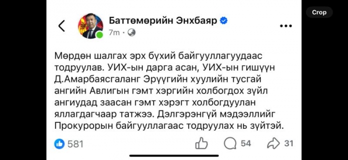 Б.Энхбаяр өчигдөр (2025.10.25) Хууль зүй, дотоод хэргийн сайдаар томилогдсон. Ерөнхий сайд Г.Занданшатар түүнийг танхимынхаа сайдаар батламжилж, Засгийн газрын ээлжит бус хуралдаанаа хийсэн. Энэ үеэр Т.Сүхболдыг ЦЕГ-ын даргаас чөлөөлсөн юм. Хууль зүй, дотоод хэргийн сайд Б.Энхбаяр дөнгөж сая фэйсбүүкт “Мөрдөн шалгах эрх бүхий байгууллагуудаас тодруулав. УИХ-ын дарга асан, УИХ-ын гишүүн Д.Амарбаясгаланг Эрүүгийн хуулийн тусгай ангийн Авлигын гэмт хэргийн холбогдох зүйл ангиудад заасан гэмт хэрэгт холбогдуулан яллагдагчаар татжээ. Дэлгэрэнгүй мэдээллийг Прокурорын байгууллагаас тодруулах нь зүйтэй” гэж мэдэгдлээ.
