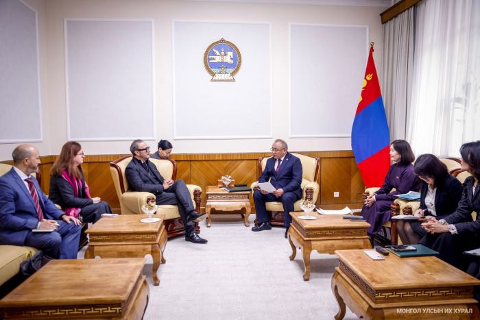 Улсын Их Хурлын гишүүн, Байгаль орчин, хүнс, хөдөө аж ахуйн байнгын хорооны дарга Б.Бейсен, Улсын Их Хурлын гишүүн Б.Мөнхбаясгалан нар /2025.10.30/ Цөлжилттэй тэмцэх тухай Нэгдсэн Үндэстний Байгууллага /НҮБ/-ын конвенцын Нарийн бичгийн газрын Тамгын газрын дарга Ражеб Булхаруф тэргүүтэй төлөөлөгчдийг хүлээн авч уулзлаа.
