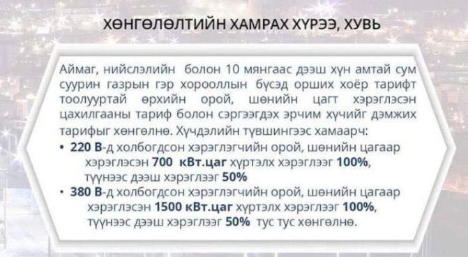 Хөнгөлөлтийг орой 21.00 цагаас өглөөний 09.00 хүртэлх хэрэглэсэн хэрэглээнд шөнийн тарифын хөнгөлөлт үзүүлнэ. Шөнийн тарифын хөнгөлөлтөд нийслэл болон аймгийн төв, 10 мянгаас дээш хүн амтай сум суурин газрын гэр хорооллын айл өрх хэрэглэгчид хамрагдах бөгөөд дараах нөхцөлийг хангасан байна.