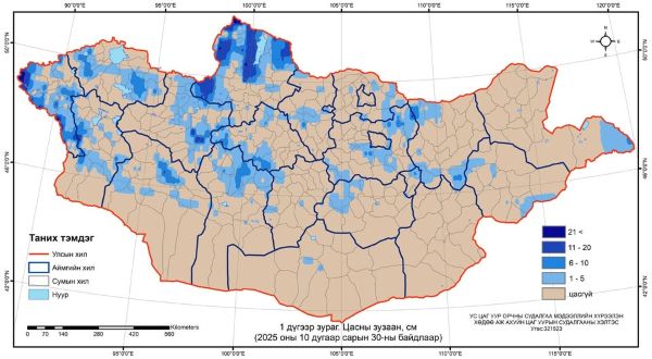 Цаг уурын байгууллагаас арав хоногт нэг удаа хийдэг хээрийн цасны хэмжилтийн мэдээгээр өнгөрөгч аравдугаар сарын 30–ны байдлаар нийт нутгийн 23 хувьд цастай байна.Үүнээс Увсын Цагаанхайрхан, Хөвсгөлийн Цэцэрлэг, Алаг-Эрдэнэ, Ренчинлхүмбэд 10-20 см, Баян–Өлгийн Сагсай, Увсын Хяргас, Ховдын Дуут, Говь-Алтайн Есөнбулаг, Хөвсгөлийн Цагаан-Үүр, Архангайн Булган, Баянхонгорын Галуутад 5-10 см, бусад нутгаар 0-5 см хүртэл зузаан цастай байна.