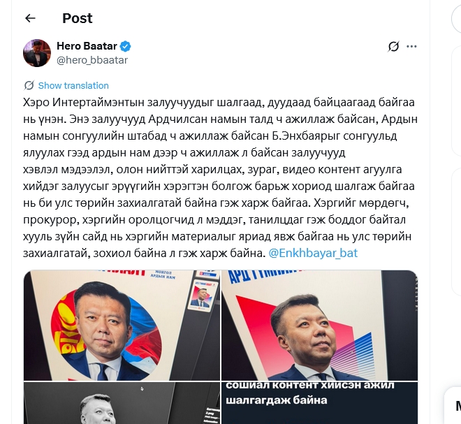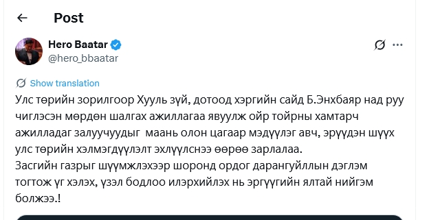 Хууль зүй, дотоод хэргийн сайд Б.Энхбаяр өнөөдөр (2025.11.07) “Монгол хаан” жүжигт санхүүжилт олгоогүй” гэж яриад байгаа юм билээ. ССАЖЗ-ын сайд асан Ч.Номингийн 2024 оны нэгдүгээр сарын 30-ны 24/1 тоот Монгол Улсын олон улс дахь сурталчилгаа, мэдээллийн Үндэсний хорооны тогтоол бий. Энэхүү тогтоолын 3.23-т “Тамгагүй төр” жүжгийг олон улсад тоглуулахад дэмжлэг үзүүлэх талаар дурдсан. Үндэсний хороог Ерөнхий сайд асан Л.Оюун-Эрдэнэ байгуулсан. “Хэро энтертайнмент”-ийн Б.Баатар иргэн Г, Э нарт захиалга өгч Засгийн газрын эсрэг сошиал контентуудыг зохион байгуулалттай хийх ажлуудыг шалгаж байгаа. Иргэн Г гадаад руу зугтсан, Э нь цагдан хоригдож байгаа. Би энэ талаар ирэх даваа гарагт хэвлэлийн бага хурал хийнэ. Бичлэг үзүүлнэ” гэсэн юм. Харин сайд асан Ч.Номин “Үндэсний хорооны төлөвлөгөөний хэсгээс тасдаж тавьсан цаас санхүүгийн баримт биш. Б.Энхбаяр сайд Монгол Улсын олон улс дахь сурталчилгаа, мэдээллийн Үндэсний хорооны гишүүн. Төлөвлөгөөг нь батлалсан хүний хувьд Монгол Улс хуультай, бодлогын процесс дараалал, төлөвлөгөө, гүйцэтгэл, хяналтын механизмтай байдгийг мэдэхийн дээдээр мэдэж байгаа” гэсэн юм. “Хэро энтертайнмент”-ийн Б.Баатар “Хууль зүй, дотоод хэргийн сайд Б.Энхбаяр улс төрийн зорилгоор над руу чиглэсэн мөрдөн шалгах ажиллагаа явуулж ойр тойрны хамтарч ажилладаг залуучуудыг маань олон цагаар мэдүүлэг авч, эрүүдэн шүүх улс төрийн хэлмэгдүүлэлт эхлүүлснээ өөрөө зарлалаа. Засгийн газрыг шүүмжлэхээр шоронд ордог дарангуйллын дэглэм тогтож үг хэлэх, үзэл бодлоо илэрхийлэх нь эргүүгийн ялтай нийгэм болжээ. “Хэро энтертайнмэнт”-ын залуучуудыг шалгаж, дуудаад байцаагаад байгаа нь үнэн. Энэ залуучууд Ардчилсан намын талд ч ажиллаж байсан, Ардын намын сонгуулийн штабт ч ажиллаж байсан. Б.Энхбаярыг сонгуульд ялуулах гээд Ардын нам дээр ч ажиллаж л байсан залуучууд. Хэвлэл мэдээлэл, олон нийттэй харилцах, зураг, видео контент агуулга хийдэг залуусыг эрүүгийн хэрэгтэн болгож барьж хориод шалгаж байгааг би “Улс төрийн захиалгатай байна” гэж харж байгаа. Хэргийг мөрдөгч, прокурор, хэргийн оролцогчид л мэддэг, танилцдаг гэж боддог байтал Хууль зүй, дотоод хэргийн сайд нь хэргийн материалыг яриад явж байгаа нь улс төрийн захиалгатай, зохиол байна л гэж харж байна” гэв.