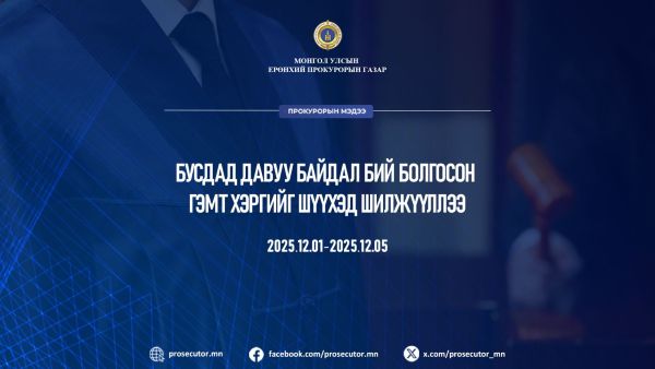 Прокурорын байгууллага 2025 оны 12 дугаар сарын 01-ний өдрөөс 05-ны өдрийг дуусталх хугацаанд хэрэг бүртгэлт, мөрдөн байцаалтын 50,074 эрүүгийн хэрэгт хяналт тавин ажиллажээ.