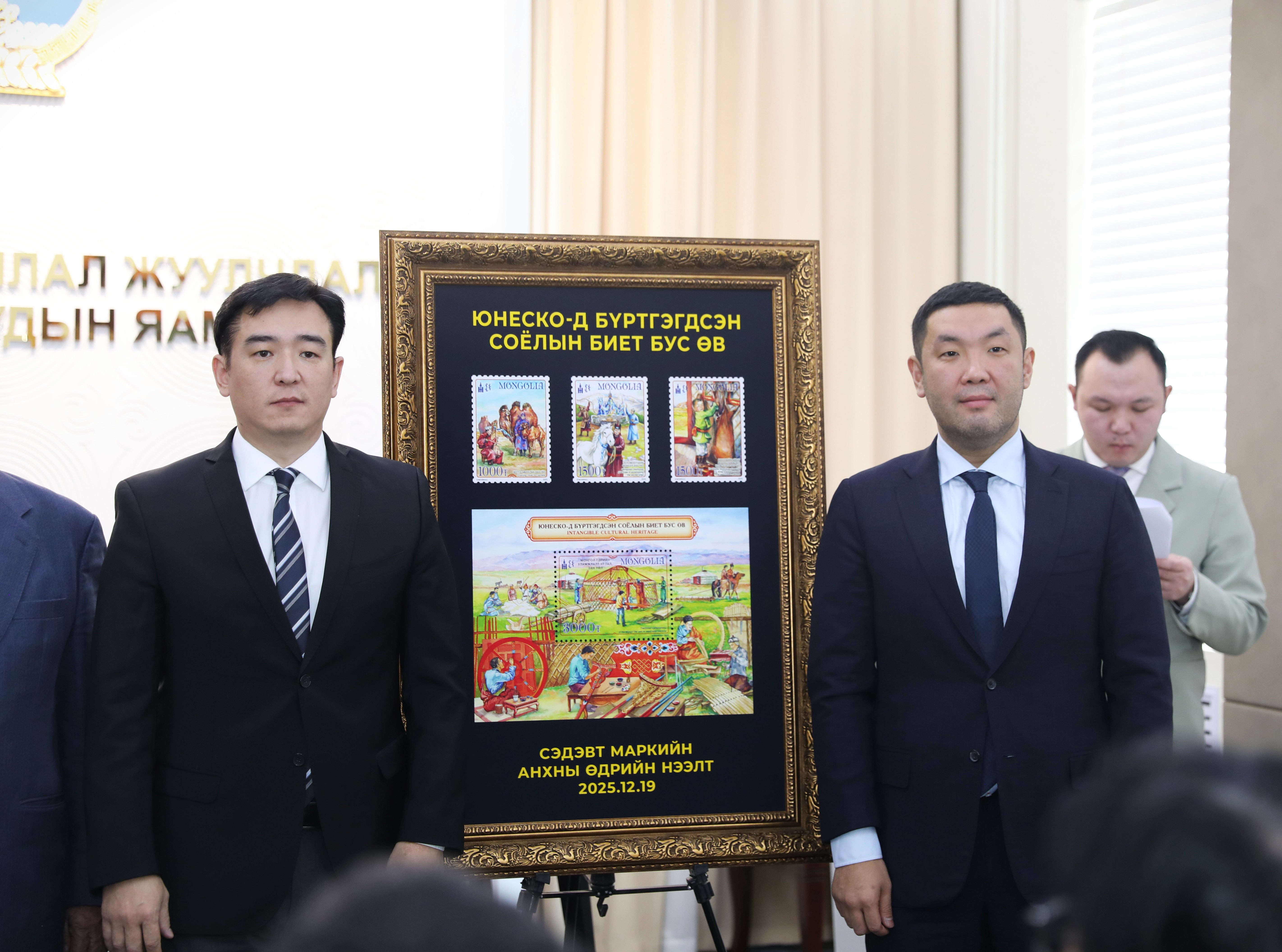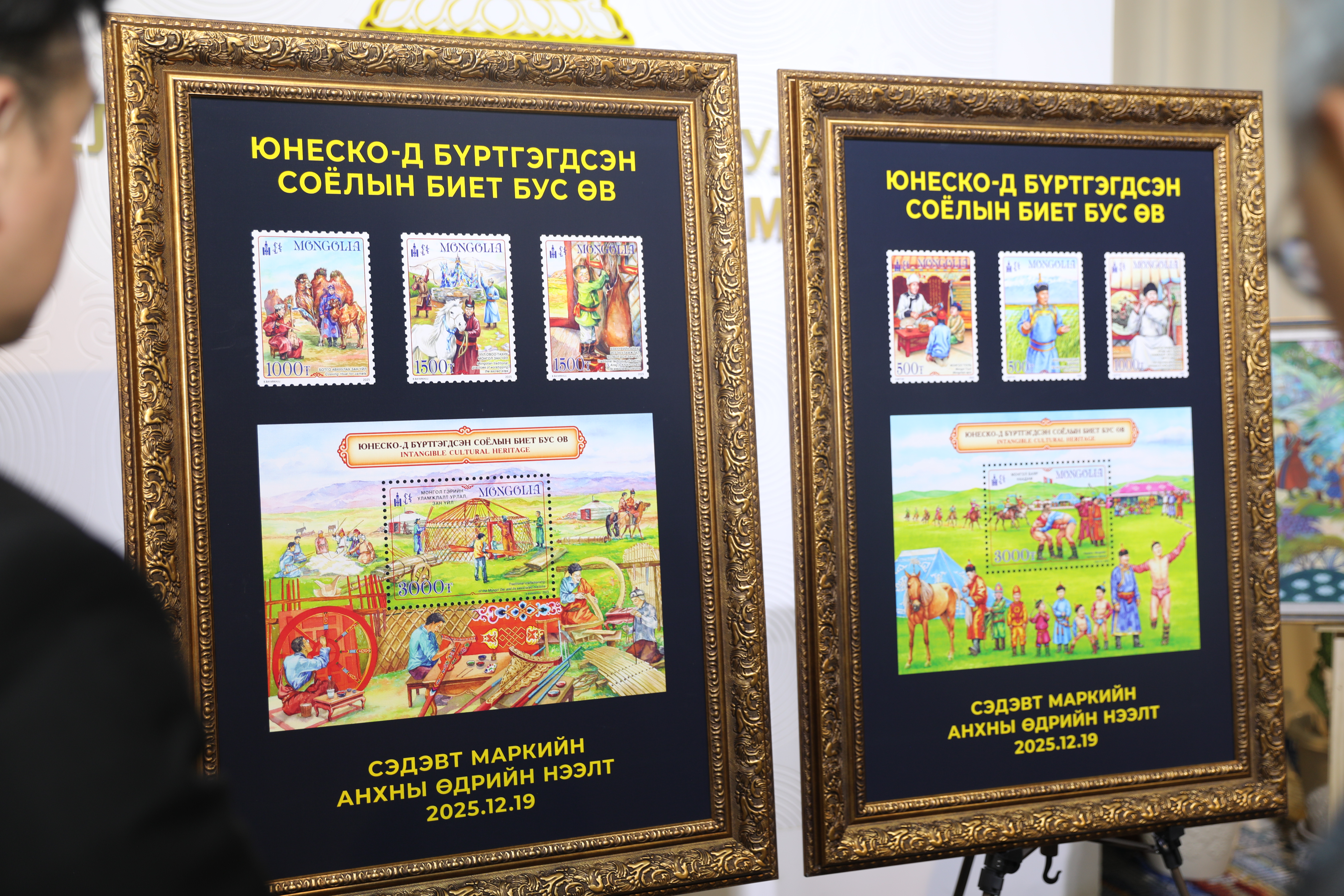 “Монгол шуудан” ХК-иас 2019 онд Төрийн их хуурч Г.Жамъяангийн мэндэлсний 100 жилийн ойд зориулан “ЮНЕСКО-д бүртгэгдсэн Монголын соёлын биет бус өвүүд” сэдвээр 2 блок, 5 нэрийн марк гүйлгээнд гаргаж байсан билээ. Өнөөдөр (2025.12.19) “Монгол шуудан” ХК-иас “ЮНЕСКО-д бүртгүүлсэн Монголын соёлын биет бус өвүүд” сэдэвт 2 блок, 6 нэрийн 2 дахь цуврал шуудангийн маркийг гүйлгээнд гаргаж байна. Маркийг бүтээхэд Соёл, спорт, аялал жуулчлал, залуучуудын яам, ЮНЕСКО-гийн Монголын Үндэсний комисс, Соёлын өвийн үндэсний төвийн хамт олон зөвлөгөө өгч, хамтран ажиллалаа.