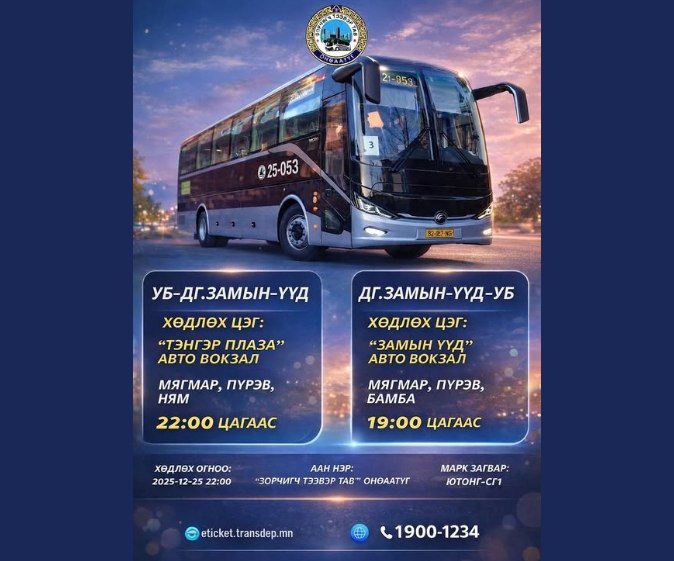 Долоо хоногийн гурван өдөр буюу Мягмар, Пүрэв Бямба гарагт хоёр талаасаа зорчих бөгөөд нийслэл хотын Баянзүрх дүүргийн нутаг дэвсгэрт байрлах Тэнгэр плазагаас 22:00 цагт автобус хөдлөх бол Замын-Үүдийн авто вокзалаас нийслэл хот руу 19:00 цагт явна гэж Нийтийн Тээврийн Бодлогын Газраас/НТБГ/ мэдээллээ.