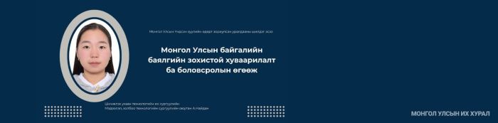 Монгол Улсын Үндсэн хуулийн өдөрт зориулан Улсын Их Хурлын Тамгын газар, Парламентын судалгаа, хөгжлийн хүрээлэнгээс зохион байгуулсан “Монгол Улс байгалийн баялгаа хэрхэн зохистой ашиглах ёстой вэ” сэдэвт уралдааны их, дээд сургуулийн оюутны ангилалд гуравдугаар байр эзэлсэн Шинжлэх ухаан технологийн их сургуулийн Мэдээлэл, холбоо технологийн сургуулийн оюутан А.Найдангийн эсээг толилуулж байна.