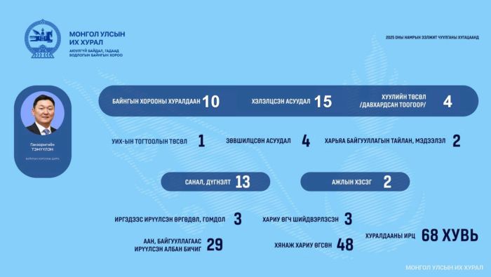 Байнгын хороо хуралдаанаараа Гадаад зээл, тусламжийн хэрэгжилт, нөхцөл байдлын талаарх Сангийн сайдын, Эрчим хүчний салбарын өнөөгийн байдал, эрчим хүчний аюулгүй байдлыг хангахад чиглэсэн бодлого, арга хэмжээ, төсөл, хөтөлбөрийн хэрэгжилт, үр дүн, хариуцлагын талаарх Эрчим хүчний сайдын мэдээллийг тус тус сонсож, хууль тогтоох, хянан шалгах үйл ажиллагаанд иргэд, сонгогчид, иргэний нийгмийн байгууллагуудын оролцоог хангах, иргэдээс санал авахад дэвшилтэт арга хэрэгслийг ашиглах эрх зүйн орчныг боловсронгуй болгох арга хэмжээний хүрээнд өргөн мэдүүлсэн, ирүүлсэн хууль тогтоомжийн төслийг D-PARLIAMENT цахим сүлжээнд оруулан, иргэдийн саналыг авчээ.