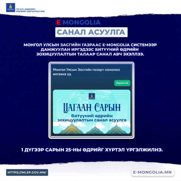 Цагаан сарын битүүний өдөр буюу 2026 оны 02 дугаар сарын 17-ны ажлын өдрийг 02 дугаар сарын 28-ны өдрийн бямба гарагт шилжүүлэн ажиллах талаар иргэдийн саналыг E-Mongolia системээр авч байна.