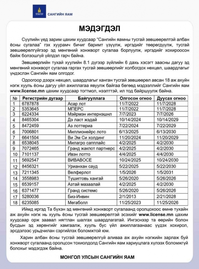 Иймд иргэд Та бүхэн эд мөнгөний хонжворт сугалаанд оролцохоос өмнө тухайн аж ахуйн нэгж нь хууль ёсны тусгай зөвшөөрөлтэй эсэхийг www.license.mn цахим хуудсаар орж нягтлан, учирч болох эрсдлээс урьдчилан сэргийлэхийг зөвлөж байна.