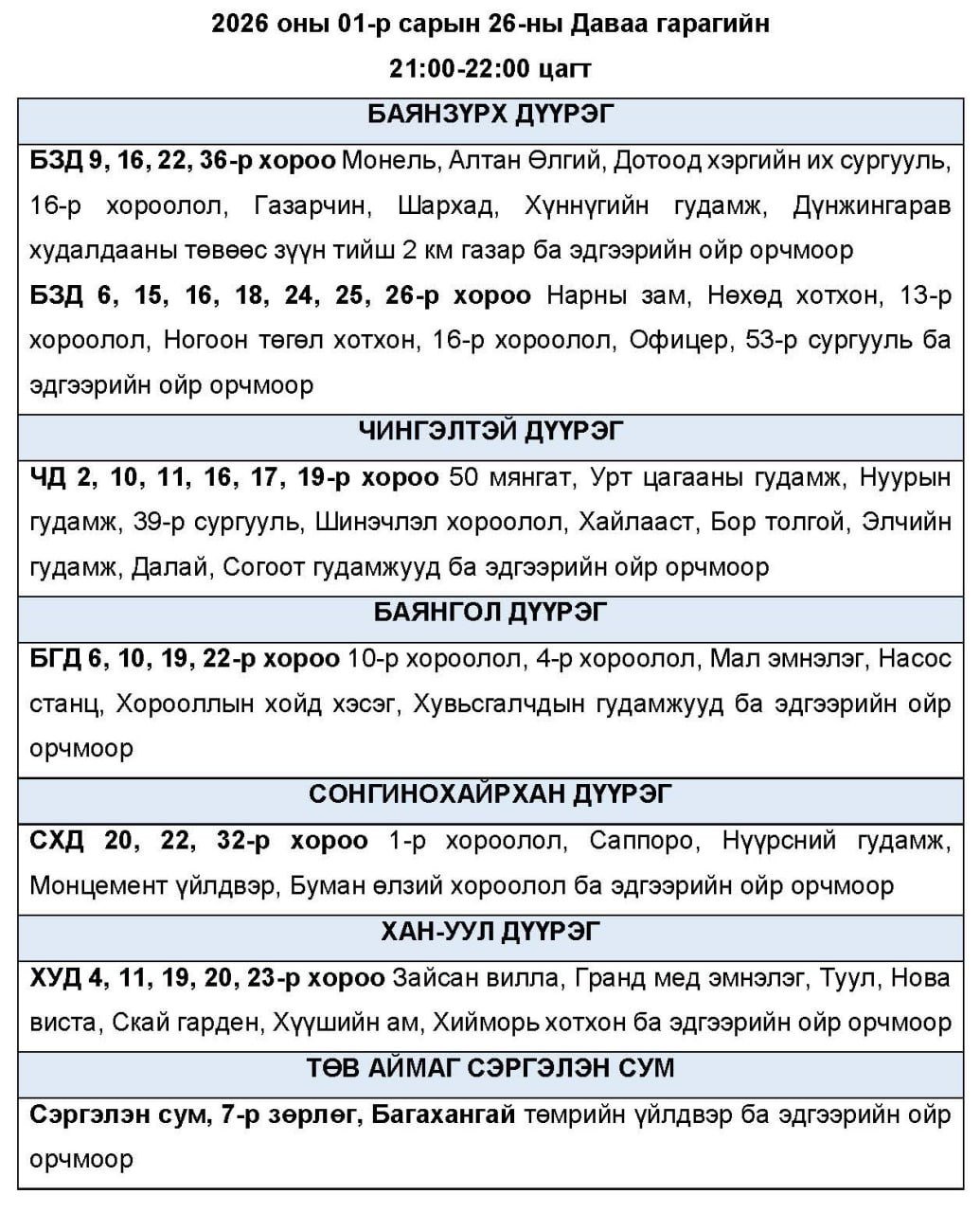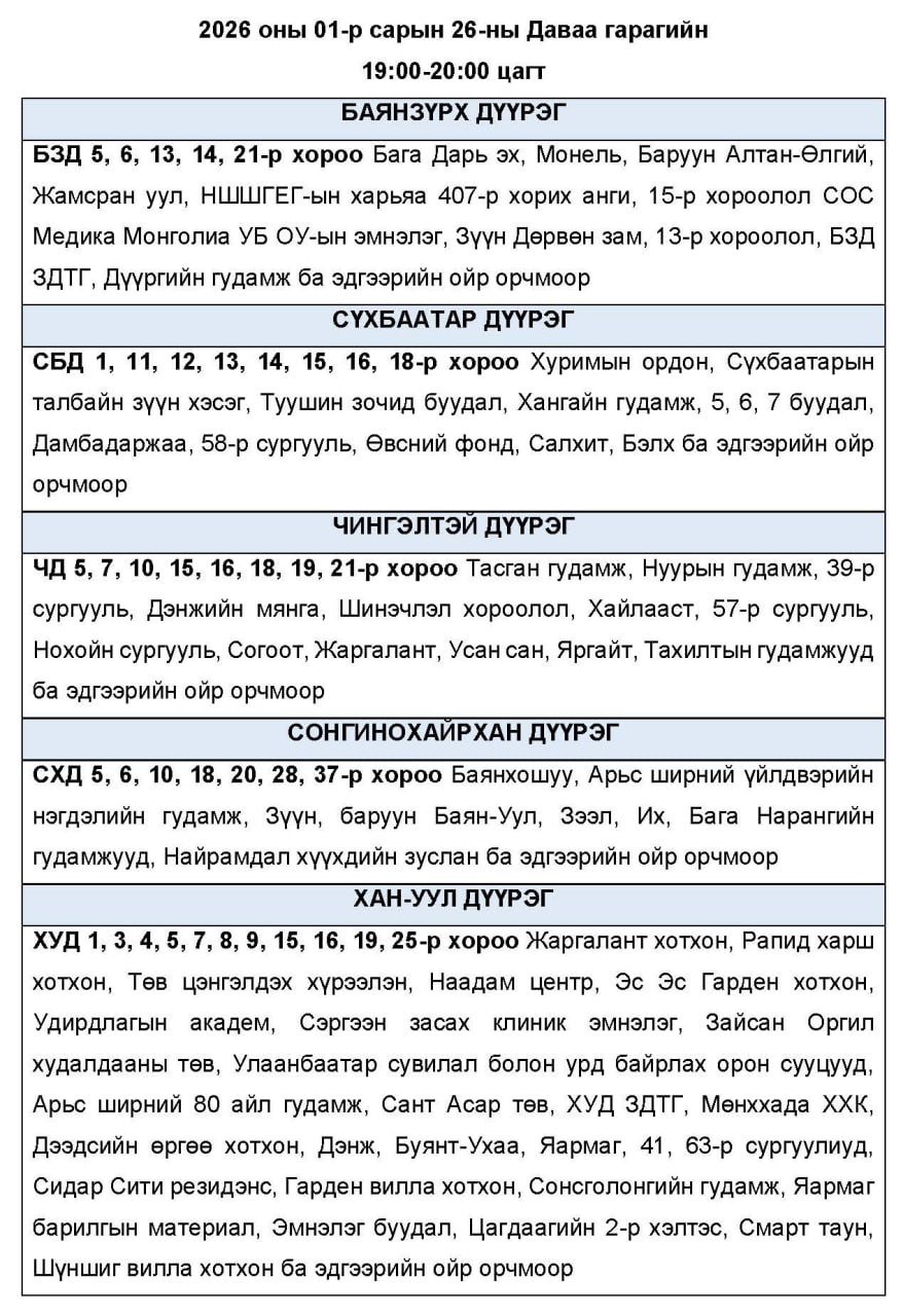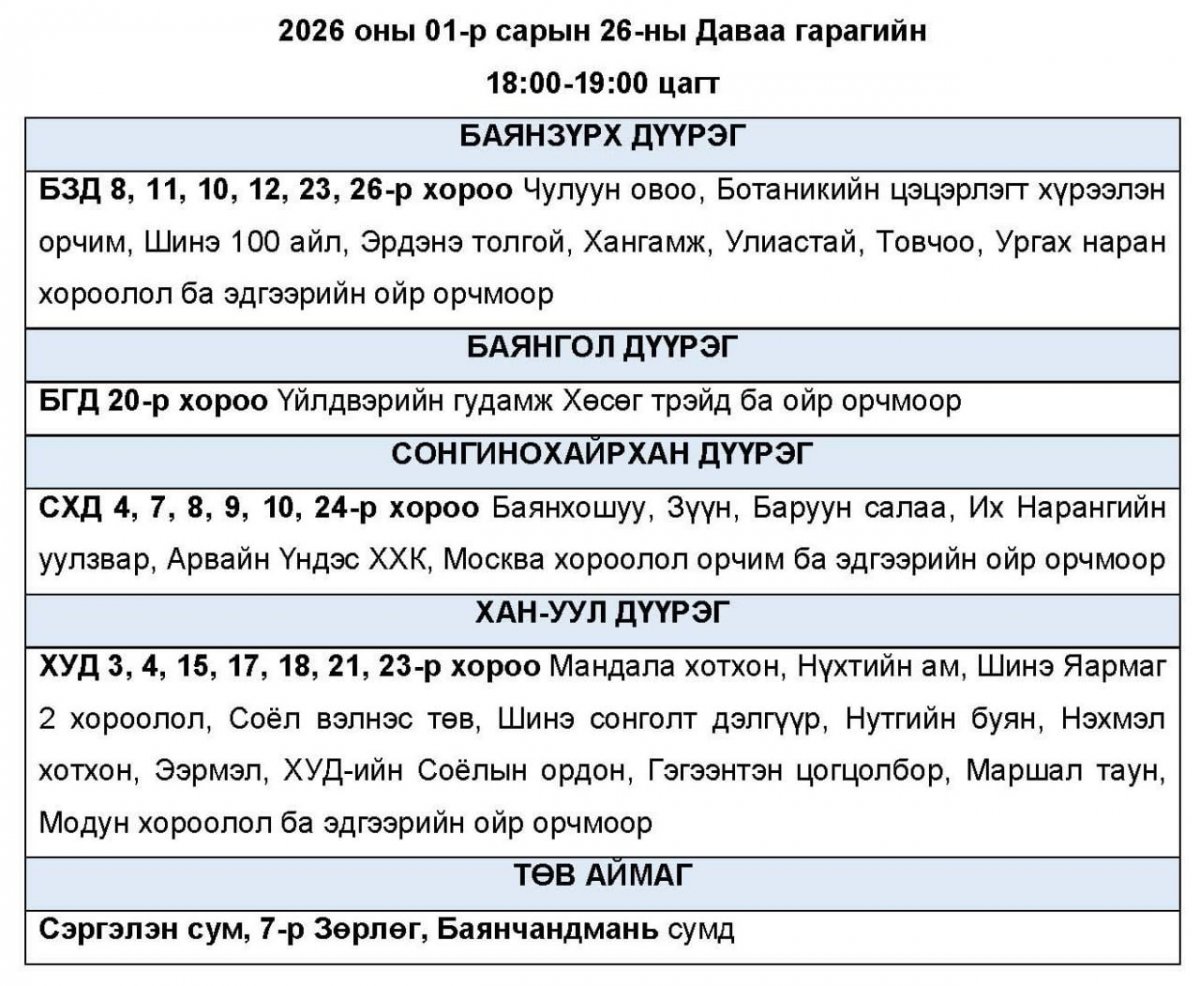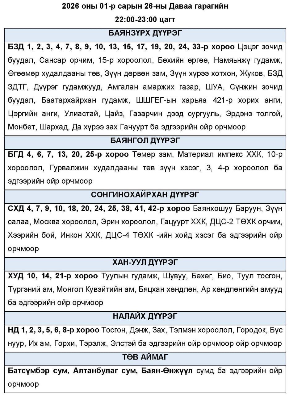 Нэгдүгээр сарын 26-ны даваа гарагт цахилгаан хязгаарлаж болзошгүй байршлуудыг УБЦТС ТӨХК-аас танилцууллаа.