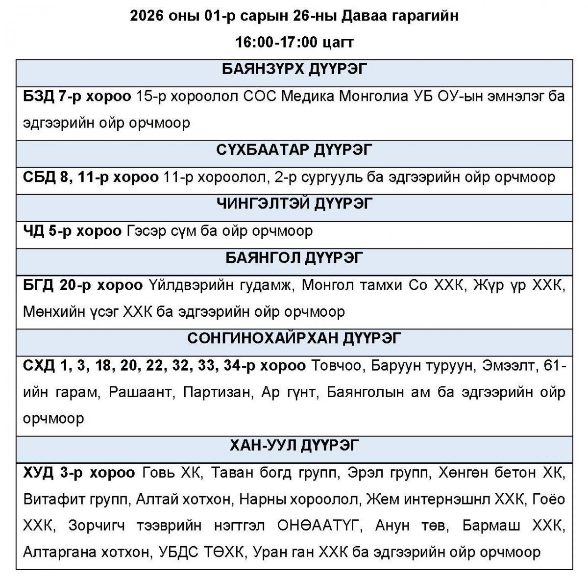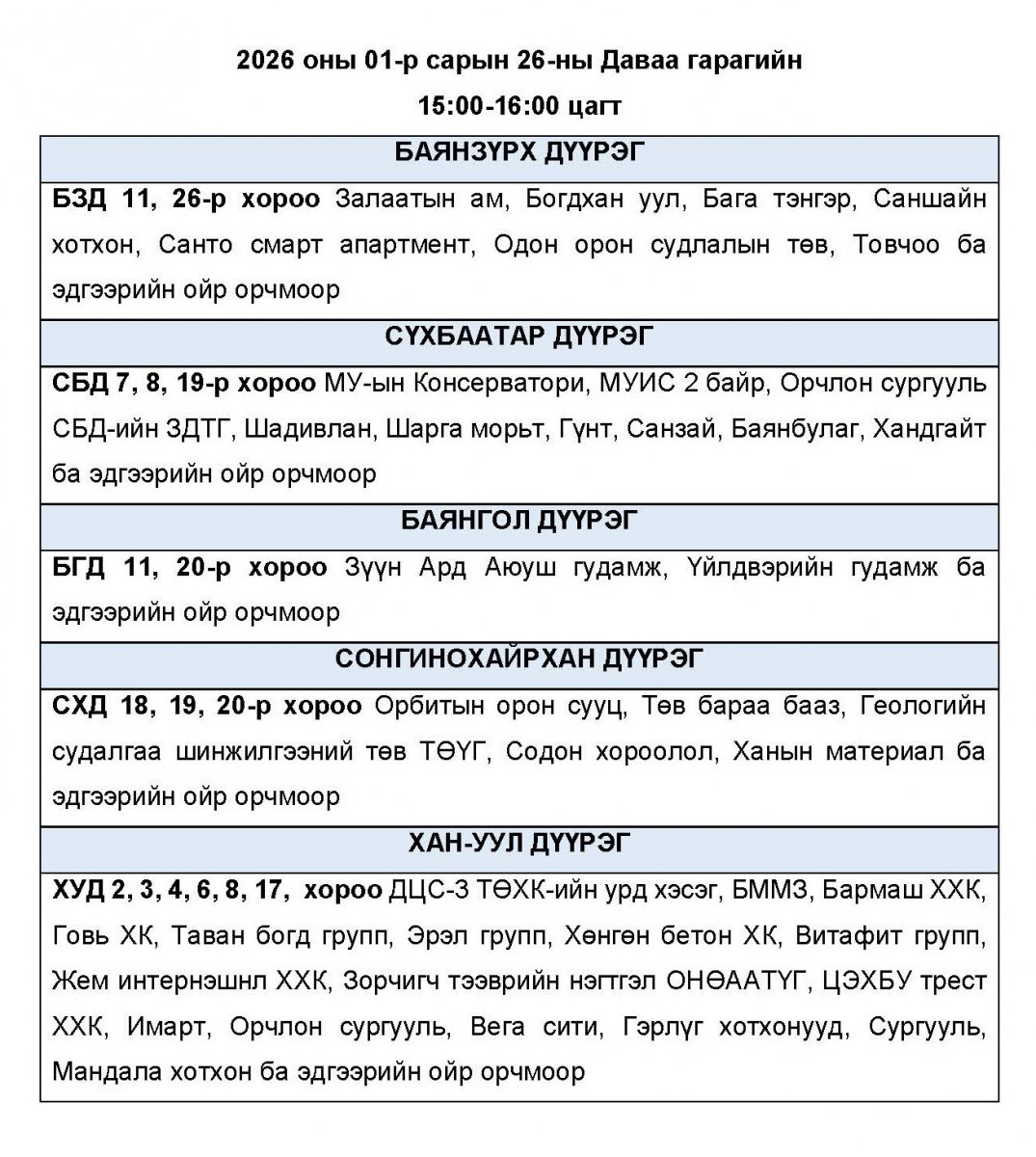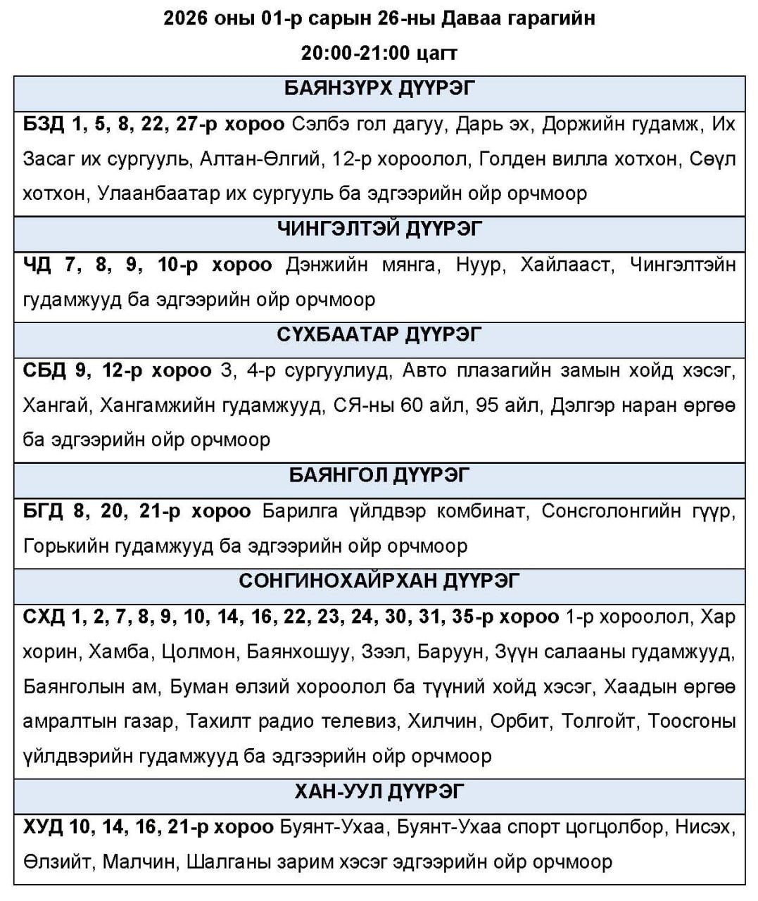 Нэгдүгээр сарын 26-ны даваа гарагт цахилгаан хязгаарлаж болзошгүй байршлуудыг УБЦТС ТӨХК-аас танилцууллаа.