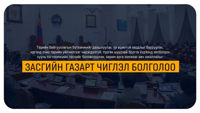 Улсын Их Хурлын 2025 оны ээлжит намрын чуулганаар “Засгийн газарт чиглэл өгөх тухай” Улсын Их Хурлын 2025 оны 114 дүгээр тогтоолыг 2025 оны 12 сарын 12 өдөр баталлаа. Энэхүү тогтоолоор төрийн байгууллагын бүтээмжийг дээшлүүлэх, үр ашиггүй зардлыг бууруулах, иргэнд очих төрийн үйлчилгээг чирэгдэлгүй, түргэн шуурхай болгох хүрээнд холбогдох хууль тогтоомжийн төслийг боловсруулах, зарим арга хэмжээг авч ажиллахыг Засгийн газарт чиглэл болгосон.