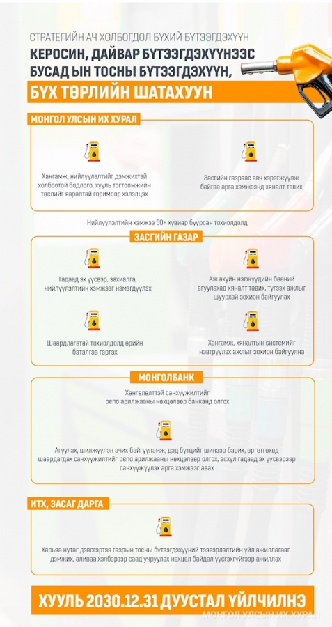 Монгол Улсын Их Хурлаас 2025 оны намрын ээлжит чуулганаар олон улсын худалдааны нөхцөл байдал, гадаад хүчин зүйлсийн нөлөөллөөс шалтгаалан дотоодын зах зээл дээр керосин, дайвар бүтээгдэхүүнээс бусад газрын тосны бүтээгдэхүүний хангамж, нийлүүлэлтийг дэмжих, учирч болзошгүй эрсдэлийг бууруулах, даван туулах арга хэмжээг тодорхойлох, холбогдох шийдвэрийг шуурхай гаргахтай холбогдсон харилцааг зохицуулах Стратегийн ач холбогдол бүхий бүтээгдэхүүний хангамж, нийлүүлэлтийг дэмжих тухай хуулийг баталсан.