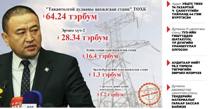 “Зууны мэдээ” сонин Нийтийн эрх ашгийн төлөөх ээлжит бүтээлээрээ эрчим хүчний салбарын эдийн засгийн “доголдол”-ын асуудлыг хөндөж байгаа билээ. Өмнөх нийтлэлээрээ бид эрчим хүчний томоохон төслүүд болох Эрдэнэбүрэнгийн УЦС, Эгийн голын УЦС, Эрчим хүч-2 төсөл, "Тавантолгой дулааны цахилгаан станц" ТӨХК-д хийсэн төрийн аудитын дүгнэлтээр санхүүгийн ямар зөрчлүүд илэрсэн талаар хүргэсэн. Тэгвэл энэ удаа Улаанбаатар цахилгаан түгээх сүлжээ ТӨХК, Дулааны III цахилгаан станц, Цахилгаан дамжуулах үндэсний сүлжээ ТӨХК-д илэрсэн зөрчлүүдийг тоймлон хүргэж байна. Үндэсний аудитын газраас Эрчим хүчний сайдын хариуцдаг байгууллагуудын санхүүгийн нэгтгэсэн тайлан, төсвийн гүйцэтгэлд аудит хийж, нийт санхүүгийн зөрчлийг 79.98 тэрбумд хүрсэн гэж дүгнэж, 189.1 сая төгрөгийн төлбөрийн 45 акт тогтоож, 74.53 тэрбум төгрөгийн 87 албан шаардлага хүргүүлж, 5.2 тэрбум төгрөгийн 75 зөвлөмж өгчээ.