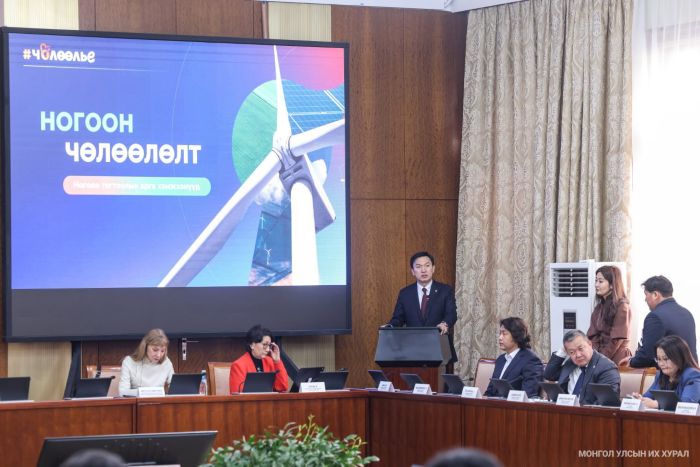 Чингэлтэй дүүрэгт хэрэгжүүлж байгаа энэ үйл ажиллагааг цаашид бусад дүүргүүд, аймгуудад нэвтрүүлэхийг Улсын Их Хурлын дарга уриалж, зүүн болон хангайн бүсийн аймгуудад ажиллахад төвийн сумдад агаарын бохирдол маш өндөр хэрнээ эрчим хүчний дутагдалтай байгааг дурдав. Иймд хувийн хэвшлийн хөрөнгө оруулагч нарт сэргээгдэх эрчим хүчний тархмал эх үүсвэр, дэд бүтэц барьж байгуулахад учирч байгаа дүрэм журам, саад тээгийг арилгаж, чөлөөлөх ёстой гэлээ. Тэрбээр сэргээгдэх эрчим хүч, цахилгаан тээврийн хэрэгслийн цэнэглэх дэд бүтэц, ногоон төслийн чиглэлээр хэрэгжсэн сайн шийдлүүдийг бодит жишээ баримтаар онцлон танилцуулж, зургаан сард барьчих нарны цахилгаан станцын зөвшөөрлийг долоон жил хүлээдэг явдлыг засаж залруулан, бизнес эрхлэгчид, хөрөнгө оруулагчдыг хүнд суртлыг шат дамжлагуудаас чөлөөлөхийг дахин уриалав. Мөн өөрийн санаачлан дэвшүүлж буй эрчим хүчний хараат бус малчин өрхийн зорилт, карбон кредитийг нэвтрүүлж, Евразийн орнуудтай худалдаа хийх боломжийг өргөжүүлэх “Нарлаг Монголын малчин” хөтөлбөрийг товч танилцуулсан юм. Евразийн Эдийн засгийн холбоо (ЕАЭЗХ)-той байгуулсан гурван жилийн хэлэлцээрийн хүрээнд арьс шир, ноос ноолуур зэрэг мал аж ахуйн гаралтай бүтээгдэхүүний татварыг хөнгөлөх, чөлөөлөх бололцоо нээгдэж байгааг Улсын Их Хурлын дарга онцолж, бэлчээрийн даацаа сайжруулж, шингээлтийг нэмэгдүүлэх, ашиглалтын горим, ачааллыг өөрчлөх шаардлагатай 30 сая орчим га газраа сэргээхийг тул карбон зах зээлд нэвтрэх хэрэгтэй гэсэн саналын малчид өөрсдөө тавьж байгаа гэдгийг дурдсан юм. Бэлчээр нутгаа зохистой ашиглаж, нөхөн сэргээж, энэ хугауцаандаа карбон ялгаруулалтыг бууруулж, үүнийхээ кредит оноог тооцуулан олон улсад зарж, малчид өөрсдөө орлого олох бололцоо байгаагаа санал болгож буй юм. Үүнийг ажил хэрэг болгохын тулд бодлого боловсруулах, хэмжих, тайлагнах, баталгаажуулах тогтолцоог бий болгох шаардлагатайг Улсын Их Хурлын тэмдэглэж, өнөөдрийн хэлэлцүүлгээр энэ асуудлыг ярилцаж, шийдэл олох нь зүйтэй гэлээ.