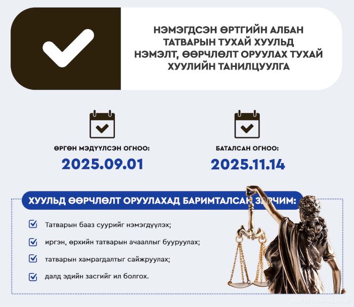 Монгол Улсын 2025 оны намрын ээлжит чуулганаар Засгийн газраас Улсын Их Хуралд өргөн мэдүүлсэн Монгол Улсын 2026 оны төсвийн тухай хуулийн төсөлтэй хамт өргөн мэдүүлсэн Нэмэгдсэн өртгийн албан татварын тухай хуульд нэмэлт, өөрчлөлт оруулах тухай, Төр, хувийн хэвшлийн түншлэлийн тухай хуульд нэмэлт, өөрчлөлт оруулах тухай хуулийн төсөл болон “Засгийн газрын үнэт цаас гаргах эрх олгох тухай” Монгол Улсын Их Хурлын тогтоолын төсөл, “Үндэсний баялгийн сангийн тухай хуулийг хэрэгжүүлэх зарим арга хэмжээний тухай” Монгол Улсын Их Хурлын тогтоолын төслийг баталсан. Энэ удаа Нэмэгдсэн өртгийн албан татварын тухай хуульд нэмэлт, өөрчлөлт оруулах тухай хуулийн талаар танилцуулж байна.