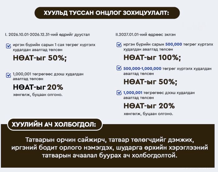 Уг хууль нь албан татварын хөнгөлөлт, чөлөөлөлтийн бодлогыг оновчтой тодорхойлж, иргэн, өрхийн татварын ачааллыг бууруулах, татварын хамрагдалтыг сайжруулах, далд эдийн засгийг бууруулахад чиглэжээ. Тухайлбал, 2026 оны 10 дугаар сарын 01-ний өдрөөс 2026 оны 12 дугаар сарын 31-ний өдрийг дуустал иргэн бүрийн сарын 1 сая төгрөг хүртэлх худалдан авалтад төлсөн нэмэгдсэн өртгийн албан татварыг 50 хувиар хөнгөлж, түүнээс дээш хэсэгт 20 хувиар хөнгөлж, буцаан олгох зохицуулалтыг тусгаж, 2027 оны 01 дүгээр сарын 01-ний өдрөөс эхлэн иргэн бүрийн сарын 500,000 төгрөг хүртэлх худалдан авалтад төлсөн нэмэгдсэн өртгийн албан татварыг 100 хувиар хөнгөлж, 500,000-1,000,000 төгрөг хүртэлх худалдан авалтад төлсөн уг албан татварыг 50 хувиар хөнгөлж, 1,000,001 төгрөгөөс дээш хэсэгт 20 хувиар хөнгөлж, буцаан олгох зохицуулалтыг тусгасан байна.
