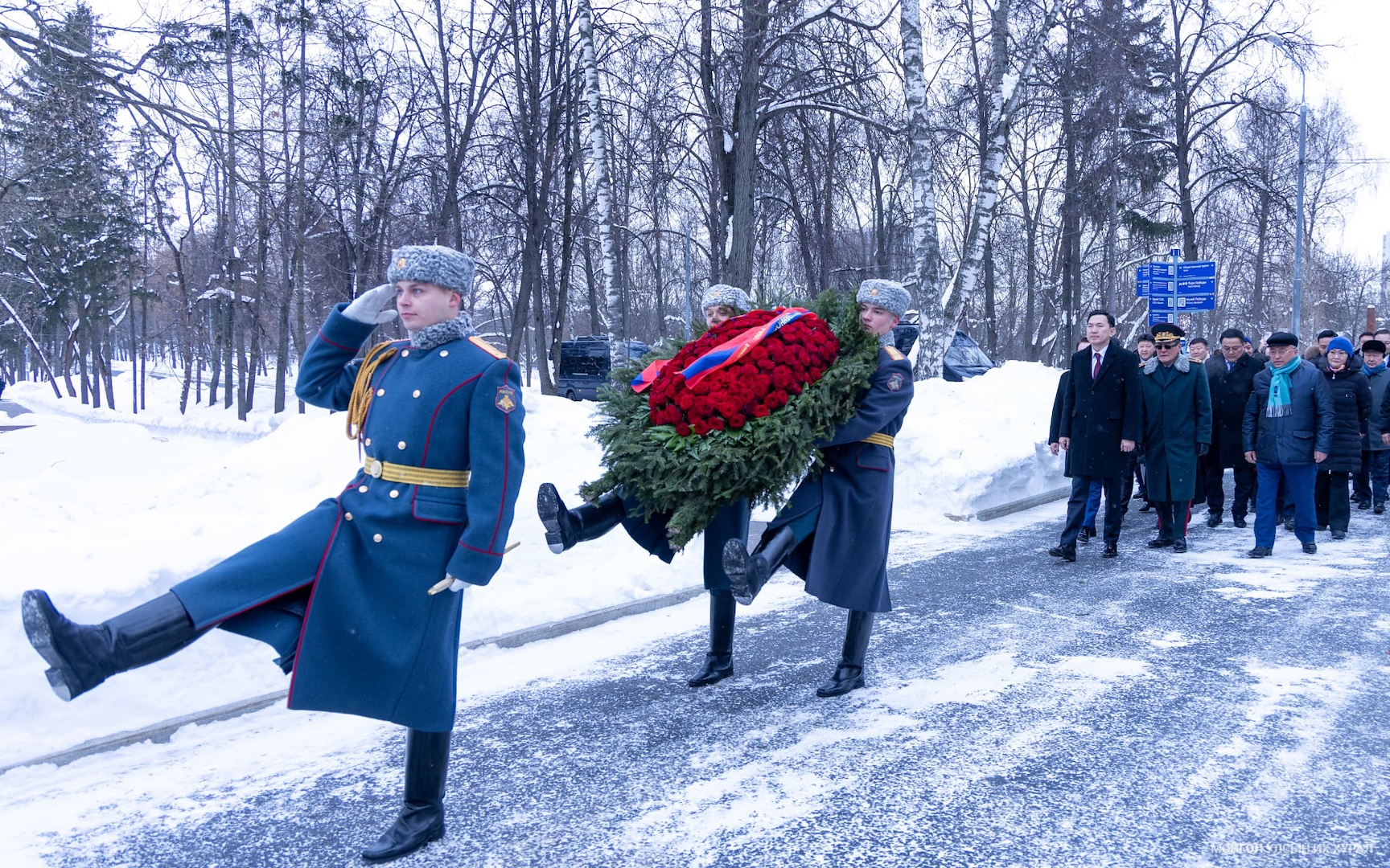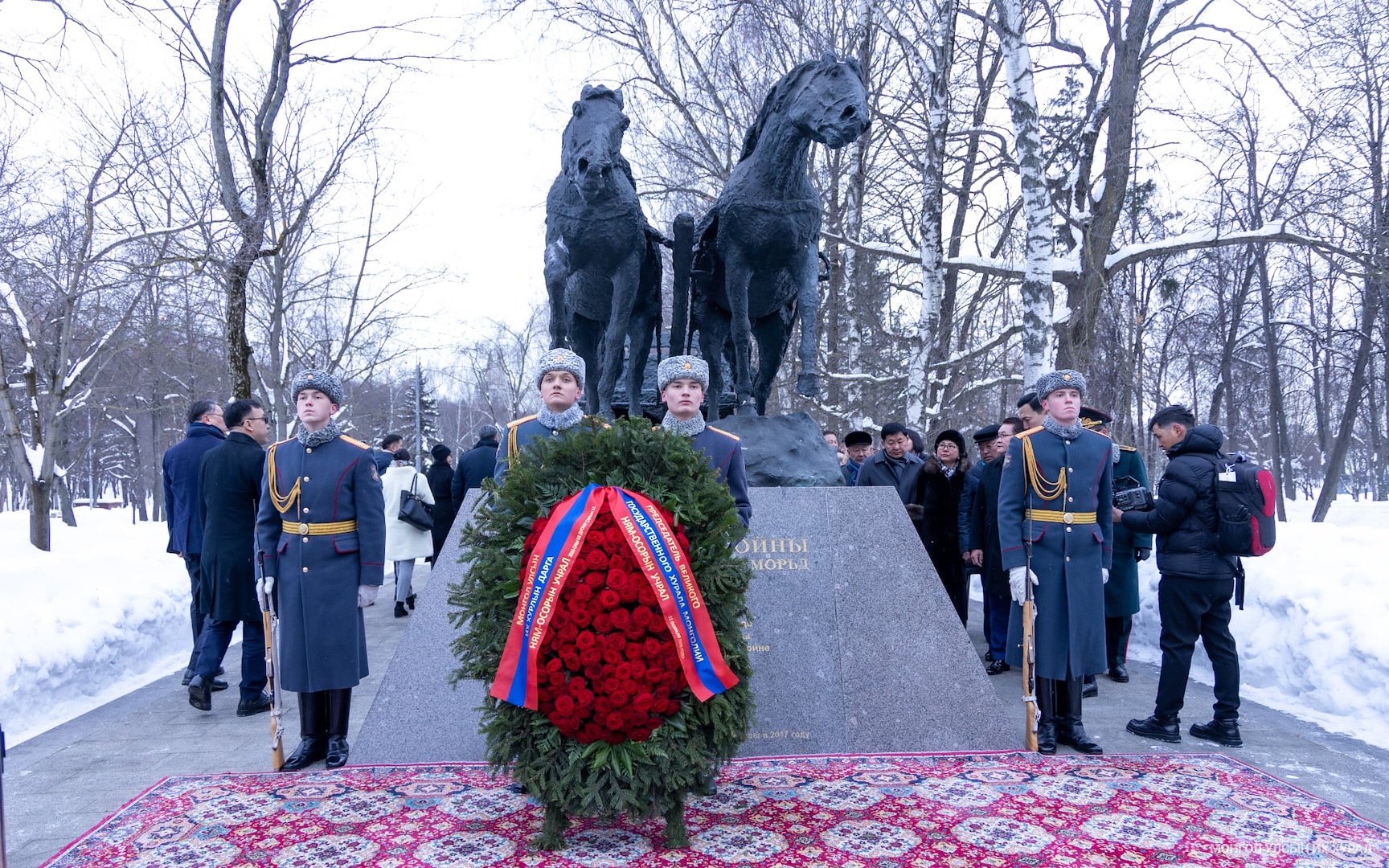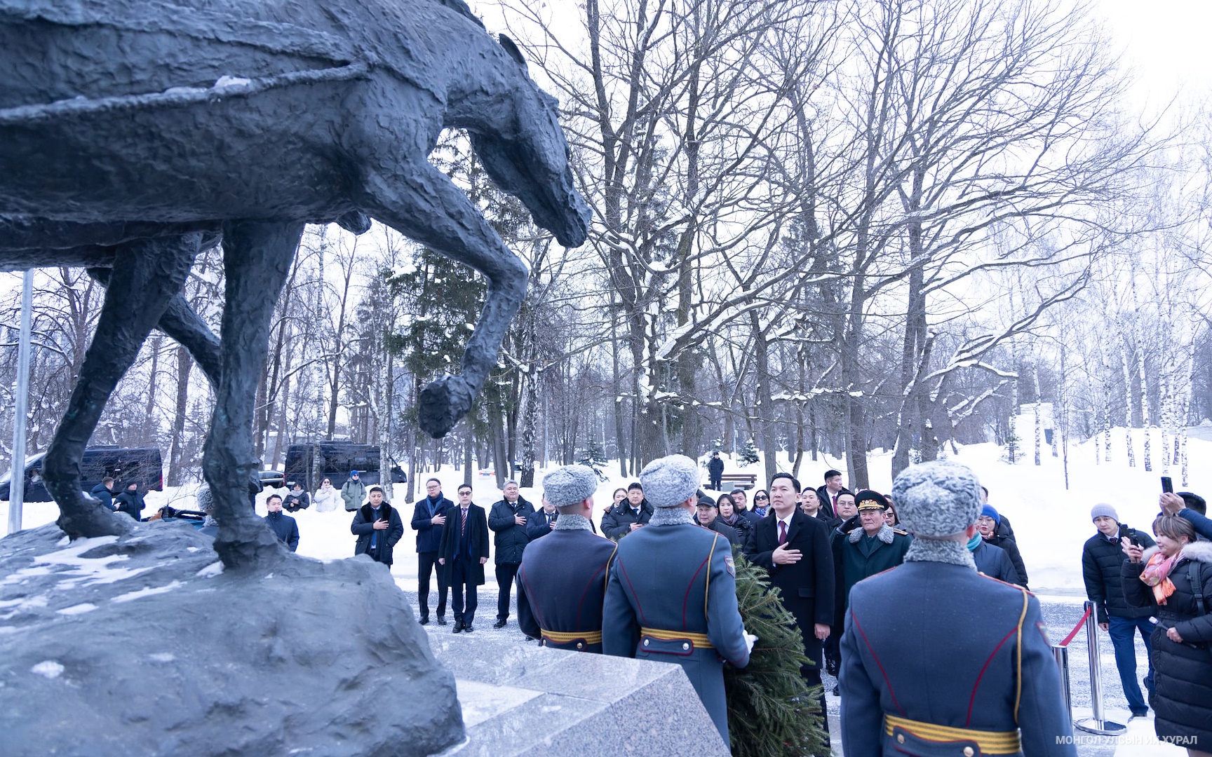 Оросын Холбооны Улсад албан ёсны айлчлал хийж буй Монгол Улсын Их Хурлын дарга Н.Учрал тэргүүтэй төлөөлөгчид өнөөдөр (2026.02.11) Москва хотын Хүндэтгэлийн дэнж дээрх “Ялалтын цэцэрлэгт хүрээлэн”-д Монголын ард түмнээс Оросын ард түмэнд бэлэг болгон барьсан “Ялалтад тэмүүлсэн морьд” хөшөөнд цэцэг өргөлөө.