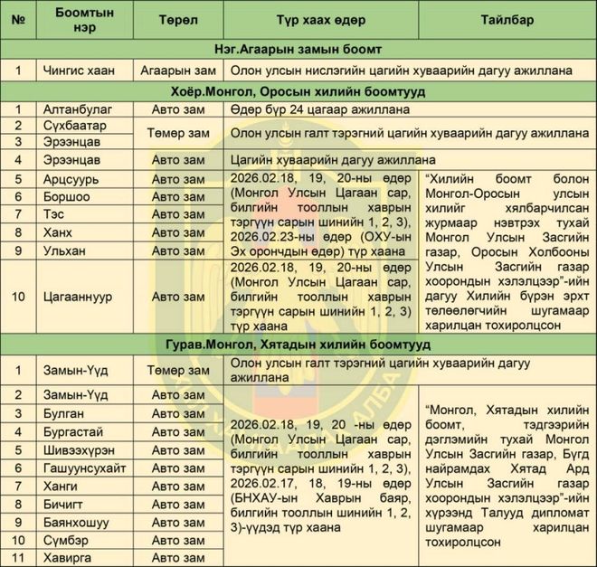 Харин Монгол, Хятадын автозамын Замын-Үүд, Булган, Бургастай, Шивээхүрэн, Гашуунсухайт, Ханги, Бичигт, Баянхошуу, Сүмбэр, Хавирга боомтууд хоёрдугаар сарын 18, 19, 20-ны өдөр болон БНХАУ-ын Хаврын баяр билгийн тооллын шинийн 1, 2, 3-ны өдрүүдэд түр хаана.