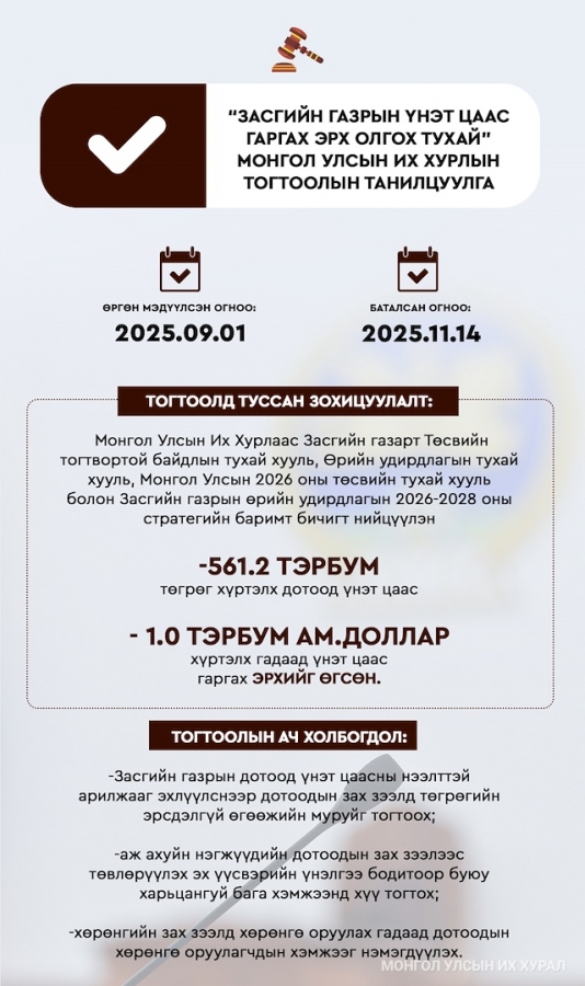 Монгол Улсын 2025 оны намрын ээлжит чуулганаар Засгийн газраас Улсын Их Хуралд өргөн мэдүүлсэн Монгол Улсын 2026 оны төсвийн тухай хуулийн төсөлтэй хамт өргөн мэдүүлсэн Нэмэгдсэн өртгийн албан татварын тухай хуульд нэмэлт, өөрчлөлт оруулах тухай, Төр, хувийн хэвшлийн түншлэлийн тухай хуульд нэмэлт, өөрчлөлт оруулах тухай хуулийн төсөл болон “Засгийн газрын үнэт цаас гаргах эрх олгох тухай” Монгол Улсын Их Хурлын тогтоолын төсөл, “Үндэсний баялгийн сангийн тухай хуулийг хэрэгжүүлэх зарим арга хэмжээний тухай” Монгол Улсын Их Хурлын тогтоолын төслийг баталсан. Энэ удаа “Засгийн газрын үнэт цаас гаргах эрх олгох тухай” Монгол Улсын Их Хурлын тогтоолыг танилцуулж байна.