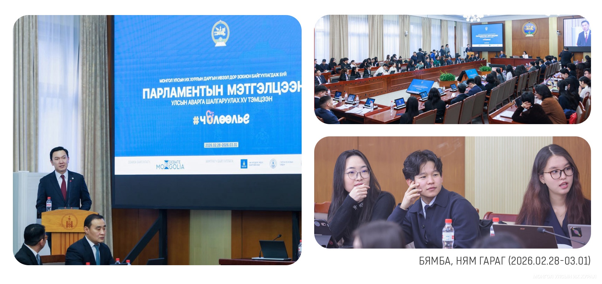Монгол Улсын Их Хурлын дарга Н.Учралын ивээл дор парламентын мэтгэлцээний улсын аварга шалгаруулах XV тэмцээнийг “Чөлөөлье” санаачилгын хүрээнд бямба, ням гарагт зохион байгууллаа. Улсын Их Хурлын дарга мэтгэлцээнийг нээж хэлсэн үгэндээ, “Чөлөөлье” санаачилгынхаа талаар танилцуулж, энэхүү санаачлага бол иргэнээ төрөөс хамгаалахын төлөөх бодитой алхам, иргэн өөрийнхөө хувь заяаг сонгон бүтээх өргөн боломжийг нээхийн төлөөх улс төрийн хүсэл зоригоос эх үүдэлтэйг онцолсон. Тус тэмцээнд 17 их, дээд сургуулийн 20 мэтгэлцээний клубийн нийт 48 шилдгийн шилдэг багууд “Чөлөөлье” уриан дор нэгдэж, парламентын мэтгэлцээнээр өөрсдийн мэдлэг чадвар, ур ухаан, авьяас билэг, судалгаа шинжилгээ, илтгэх ур чадвараараа өрсөлдөн аваргаа тодрууллаа... https://www.parliament.mn/nn/76739/