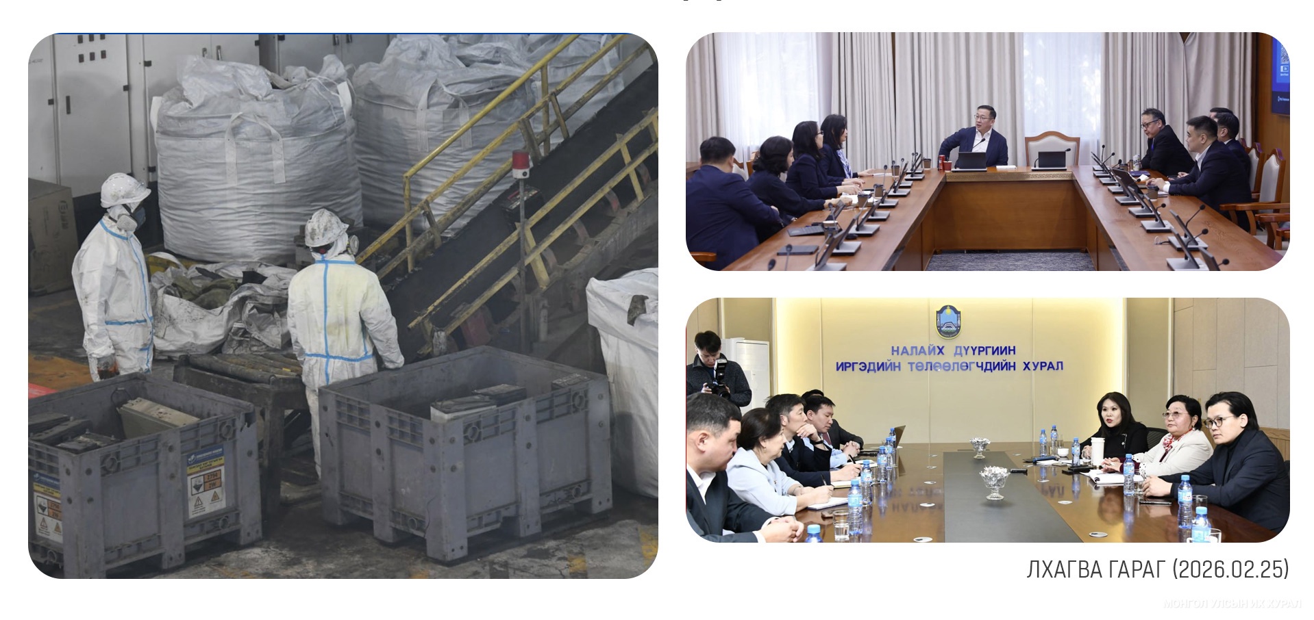 Хог хаягдлын тухай хуулийн хэрэгжилтийг хянан шалгах, холбогдох шийдвэрийн төсөл боловсруулах, санал, дүгнэлт гаргах үүрэг бүхий ажлын хэсгийн ахлагч, Улсын Их Хурлын гишүүн Б.Мөнхсоёл, Улсын Их Хурлын гишүүн С.Замира нар Налайх дүүрэгт ажиллахдаа ажлын хэсэг Монгол Улсын хог хаягдлын асуудлын түвшинг ахиулах зорилготойгоор ажиллаж байгаагаа онцлов...