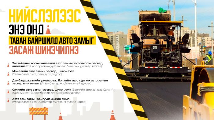 Нийслэлээс 2026 онд 52 км авто замыг шинээр барьж, таван байршилд авто замын засвар шинэчлэлтийг хийнэ. Авто замын засвар шинэчлэлтийг дөрөвдүгээр сарын 1-нээс эхэлнэ. Нийслэлийн хэмжээнд 2024 оны есдүгээр сараас 2025 оны есдүгээр сар хүртэл нэг жилийн хугацаанд 86 байршилд 233 км авто замыг шинэчилж байв. Тэгвэл энэ онд засвар шинэчлэлт хийх авто замын талаар мэдээлэл хүргэж байна.