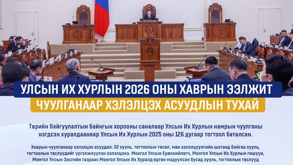 Хаврын ээлжит чуулганаар хэлэлцэх асуудлын жагсаалтыг Төрийн байгуулалтын байнгын хорооны саналаар Улсын Их Хурлын намрын чуулганы нэгдсэн хуралдаанаар хэлэлцэж, “Монгол Улсын Их Хурлын 2026 оны хаврын ээлжит чуулганаар хэлэлцэх асуудлын тухай” Улсын Их Хурлын 2025 оны 126 дугаар тогтоолыг баталсан. Ээлжит чуулганаар дараах асуудлыг хэлэлцэнэ.