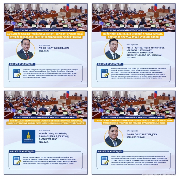 Хууль тогтоомжийн төслүүдэд хүний эрхийн болон зохицуулалтын шинжилгээ хийхийг хүсвэл парламентын цахим талбар дахь D-Parliament: AI дүн шинжилгээ цэсэнд хандах боломжтой.