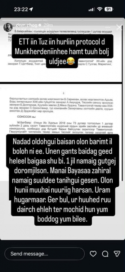Ерөнхий сайд асан Л.Оюун-Эрдэнэ өчигдөр (23.03.2026) Хууль зүй, дотоод хэргийн сайд Б.Энхбаярт холбогдох гэмт хэрэг, авлигын шинжтэй үйлдлийг шалгуулахаар АТГ-т хандсан. Тэрбээр “Миний бие саяхан Б.Энхбаяр сайдыг “Бодь интернэшнл” ХХК-ийн захирал Д.Баясгалангаас 500 мянган ам.доллараар нэг удаа, 800 мянган ам.доллараар дахин нэг удаа, нийт 1.3 сая ам.доллар бэлнээр авсан байж болзошгүй ноцтой асуудлыг олж мэдсэн. Иймд Б.Энхбаяр сайдад холбогдох дээрх асуудлыг гэрчлэх хоёр хүний хувийн мэдээлэл, дүрс бичлэг зэрэг шаардлагатай нотлох баримтуудын хамт шалгуулахаар хүргүүлж байна. Б.Энхбаяр нь энэхүү авлига, хуйвалдааныг өөрийн хамтран зүтгэгч Хууль зүй, дотоод хэргийн дэд сайд Д.Мөнх-Эрдэнэтэй хамтран зохион байгуулсан байж болзошгүй байна” гэж мэдээлсэн. Харин Хууль зүй, дотоод хэргийн сайд Б.Энхбаяр, дэд сайд Д.Мөнх-Эрдэнэ нар Л.Оюун-Эрдэнийн мэдээллийг үгүйсгэсэн бол “Бодь интернэшнл” ХХК-аас мөн л “Л.Оюун-Эрдэнэ ор үндэслэлгүй гүтгэлээ“ гэсэн утгатай мэдэгдэл гаргав. Хууль зүй, дотоод хэргийн сайд Д.Мөнх-Эрдэнэ “Би “Бодь интернэшнл” ХХК-ийн хуулийн зөвлөхөөр ажиллаж байгаагүй” гэж мэдэгдсэний дараа Ерөнхий сайд асан Л.Оюун-Эрдэнэ фэйсбүүкт “Эрдэнэс Тавантолгой” ХК-ийн ТУЗ-ийн 2019 оны арваннэгдүгээр сарын 12-ны хурлын тэмдэглэлийг постолж, Д.Мөнх-Эрдэнэ тухайн үед “Бодь интернэшнл” ХХК-ийн хуулийн зөвлөхийн хувьд энэ хуралд оролцож байсныг нотолсон баримт дэлгэлээ. Тэгвэл “Бодь интернэшнл” ХХК-ийн гүйцэтгэх захирал асан А.Амундра инстаграм хуудаснаа стори хийжээ. Тэрбээр “Хэзээ нэг их үндэсний бүтээн байгуулагч байсан юм. Ингээд худлаа яриад эхэлнэ. Намайг ажил авахад өрөнд баригдсан 10 ажилтантай компани болсон байсан. За, тэр Д.Мөнх-Эрдэнэ бол гуниг шүү. Би хэн нэгний талд орох гэсэнгүй. Гэхдээ бүгд мэдэж байгаа шүү дээ. “Бодь интернэшнл” ХХК-тай гэрээ хийгээд энэ төсөл дээр хуулийн зөвлөхөөр ажиллаж байсныг нь. “Бодь интернэшнл” ХХК-ийнхан одоо гэрээгээ устгаж байгаа биз. Ингэж битгий худлаа ярь аа, Д.Мөнх-Эрдэнэ ээ. Тэр үед хуралд хамт сууж байсан залуус бүгд амьд сэрүүн байна. “Эрдэнэс Тавантолгой” ХК-ийн ТУЗ-ийн хурлын протокол Д.Мөнх-Эрдэнэтэй хамт түүх болон үлджээ. Надад олдохгүй байсан олон баримт ил болох нь. “Үнэн ганц байдаг” гэж хэлээд байгаа шүү, би. Намайг нэг жил гүтгэж доромжилсон. Манай Баясаа захирал намайг сүүлдээ танихгүй гэсэн. Олон хүний муухай нүүрийг харсан. Урам хугармаар. Гэр бүл, үр хүүхэд рүү дайрч эхлэх тэр мөчид хүн юм боддог юм билээ. Дахиад “Ална тална” болж байгаа юм байна. Би Peninsula Shanghai зочид буудалд байна. Зугтсан юм байхгүй. Ярих боломжоо ашиглах гэж л хүлээлээ. Олон нийтэд гэхээс илүү хууль ёсны дагуу мэдүүлэг, нотлох баримтаа өгчихөөд Монгол руу шууд ниснэ ээ. Бүх хэлмэгдүүлэлтийг нь хүлээж авахад бэлэн байна” гэжээ.