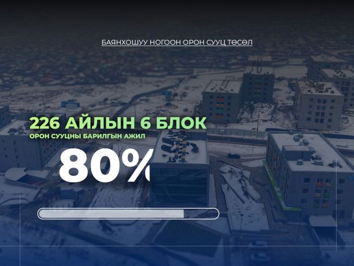 Түүнчлэн Шархадны 5.4 га талбайд эхний ээлжид 338 айлын 10 блок орон сууц, үйлчилгээний төв барина. Өнөөдрийн байдлаар 110 айлын дөрвөн блок орон сууцны барилга угсралтын ажлын явц 99 хувьд хүрсэн. Мөн 228 айлын зургаан блок орон сууцны барилгын ажил 49-77 хувийн явцтай байгаа юм.