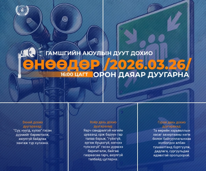 Гамшгийн аюулын тухай зарлан мэдээллийн дохиогоор ажиллах дадлага сургуульд ард, иргэд та бүхнийг идэвхтэй оролцож, гамшгийн үеийн дуут дохио дуугарсан үед авах арга хэмжээний талаарх мэдлэгээ бататгахыг уриалж байна.