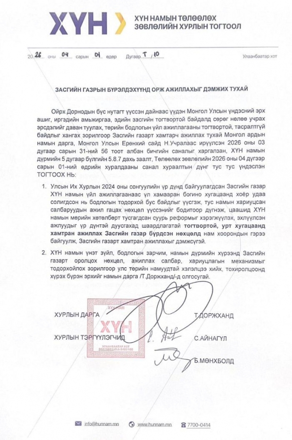ХҮН намд хоёр сайдын суудал өгөх асуудал яригдаж буй бөгөөд намын дарга Т.Доржханд, УИХ-ын гишүүн Б.Найдалаа нар Засгийн газрын гишүүнээр ажиллана. Ингэхдээ эрчим хүчний салбарт ажиллах сонирхолтой байгаагаа илэрхийлсэн билээ.