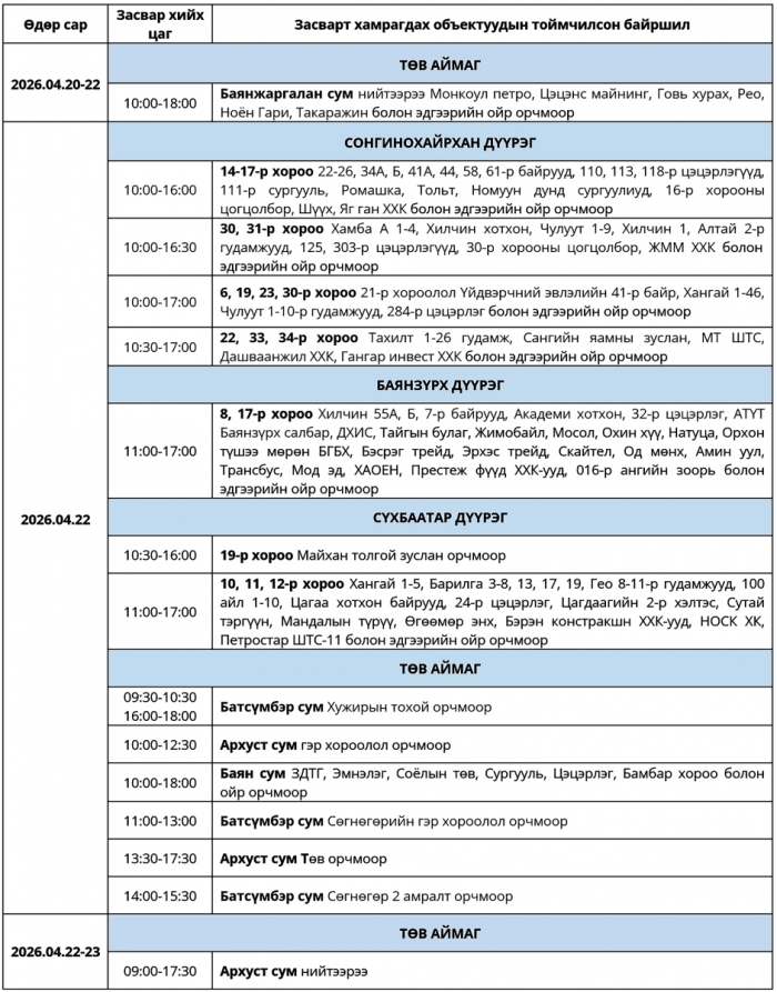 Өнөөдөр буюу 2026 оны дөрөвдүгээр сарын 22-ны Лхагва гарагт цахилгаан шугам сүлжээнд хийх засварын хуваарийг танилцуулж байна.