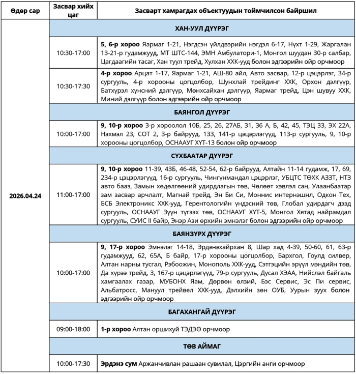 Өнөөдөр буюу 2026 оны дөрөвдүгээр сарын 24-ний Баасан гарагт цахилгаан шугам сүлжээнд хийх засварын хуваарийг танилцуулж байна.